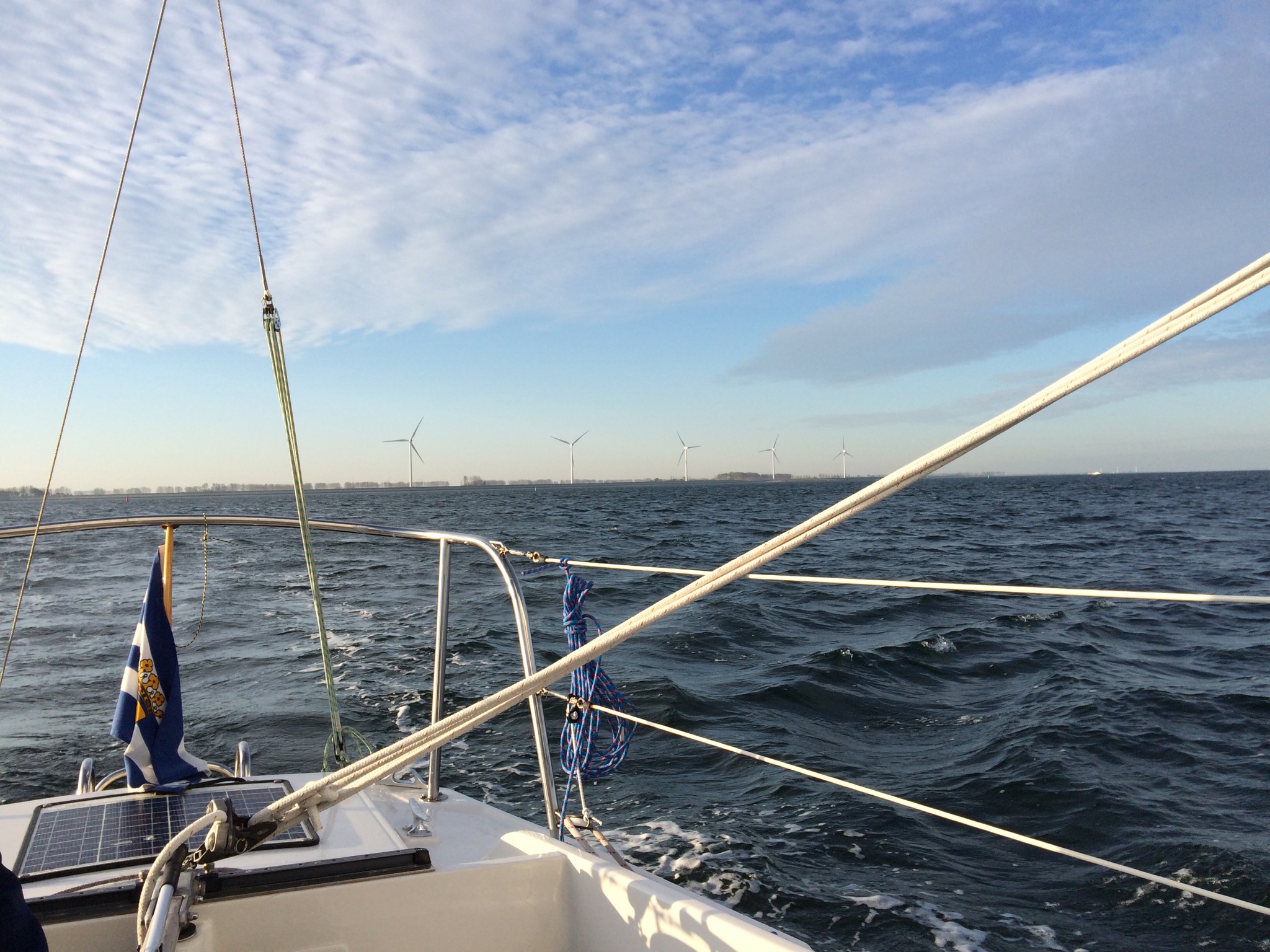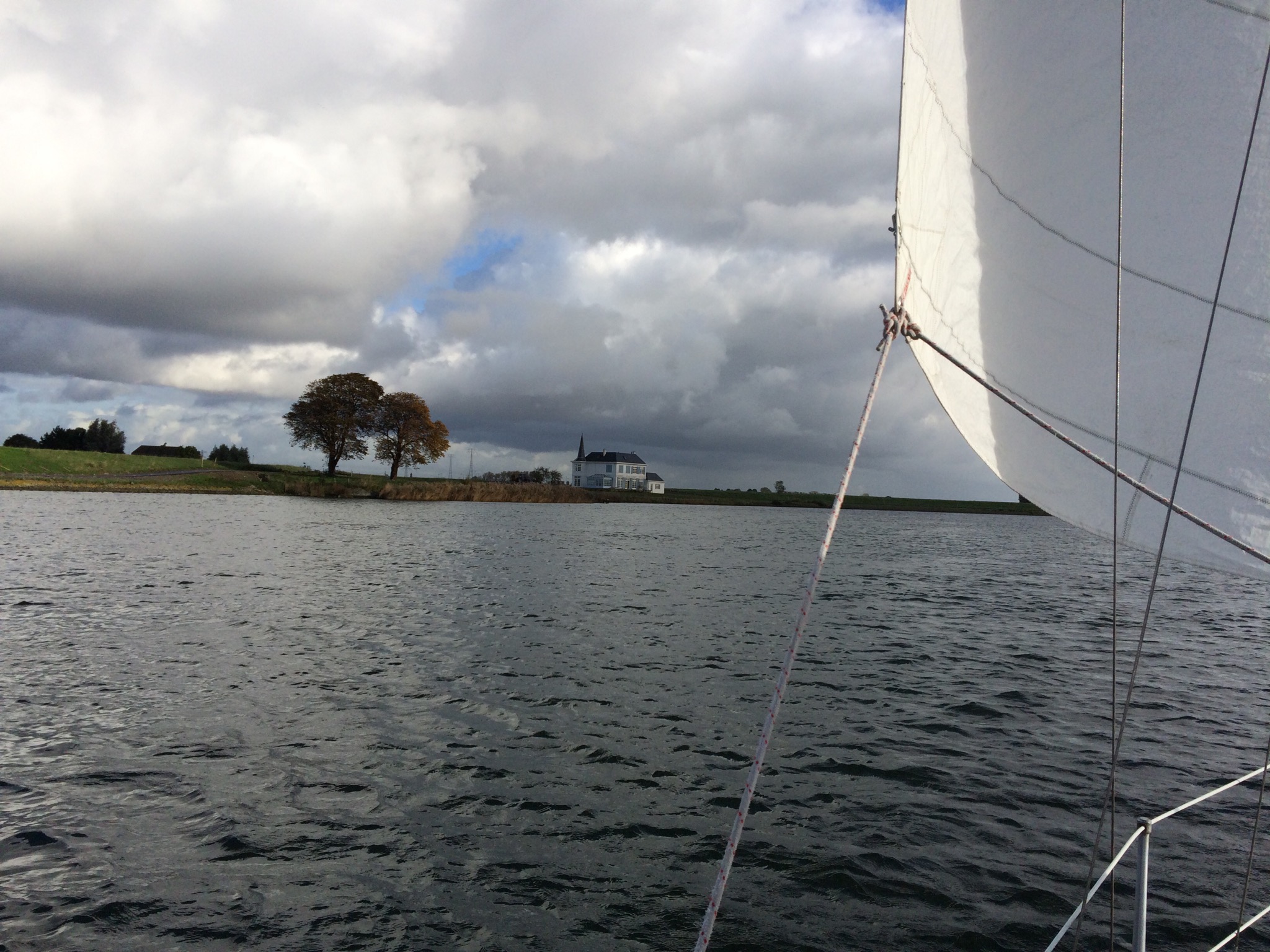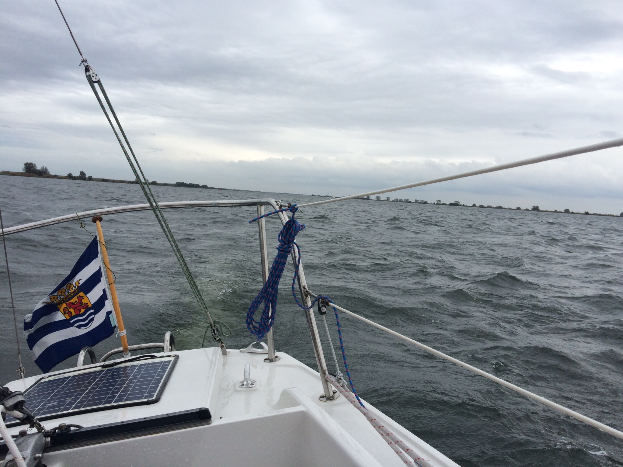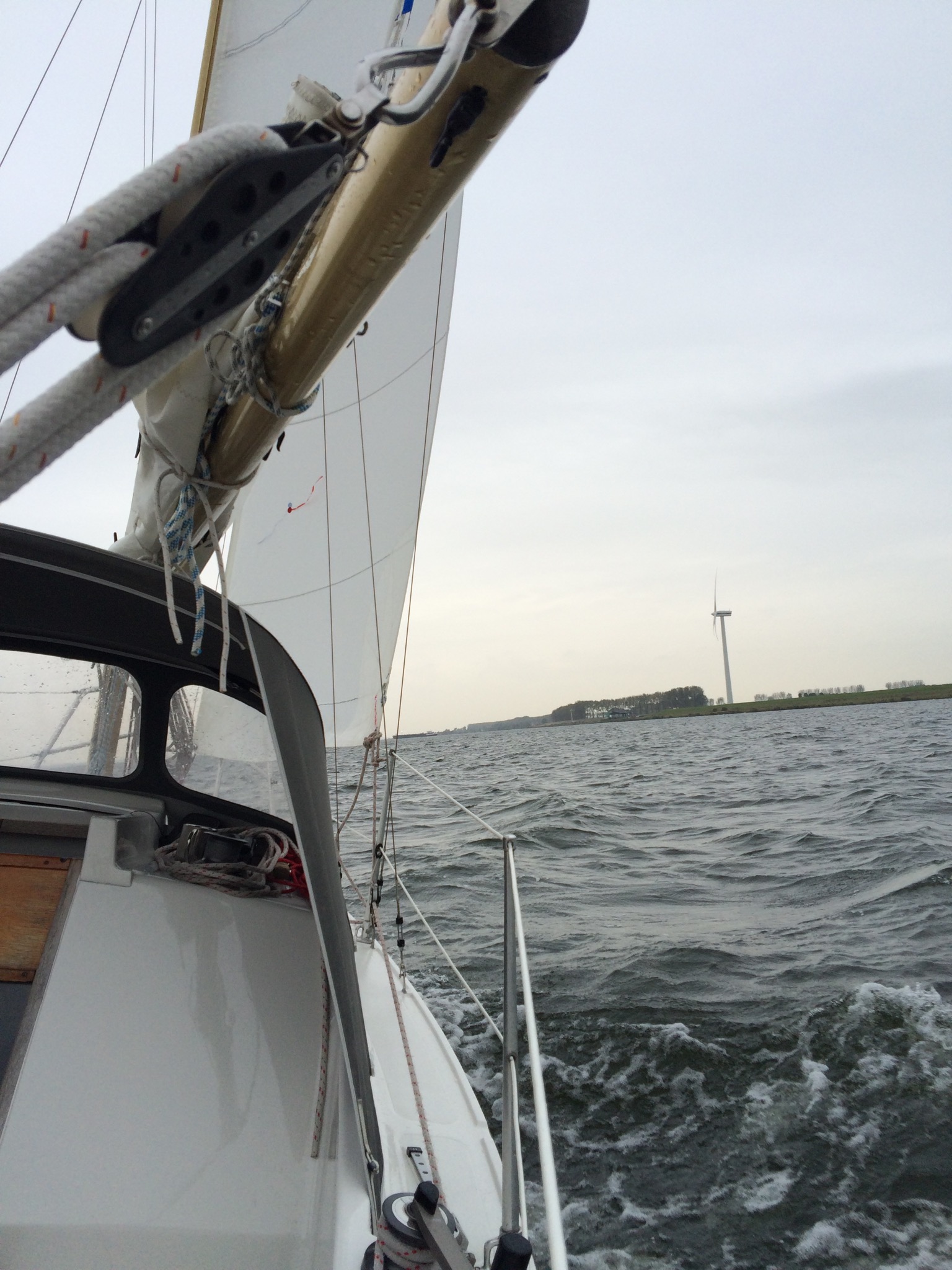 Het zeilen gaat fijn, en hard. We kregen het niet op de foto, maar af en toe liepen we 6 knopen. Dat is met dit tuig Hard! Ok, het helpt wel dat het ook Hard waait.
