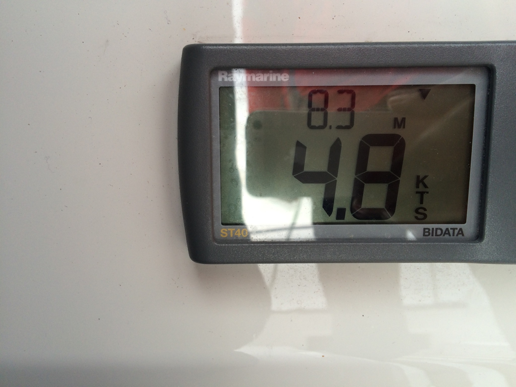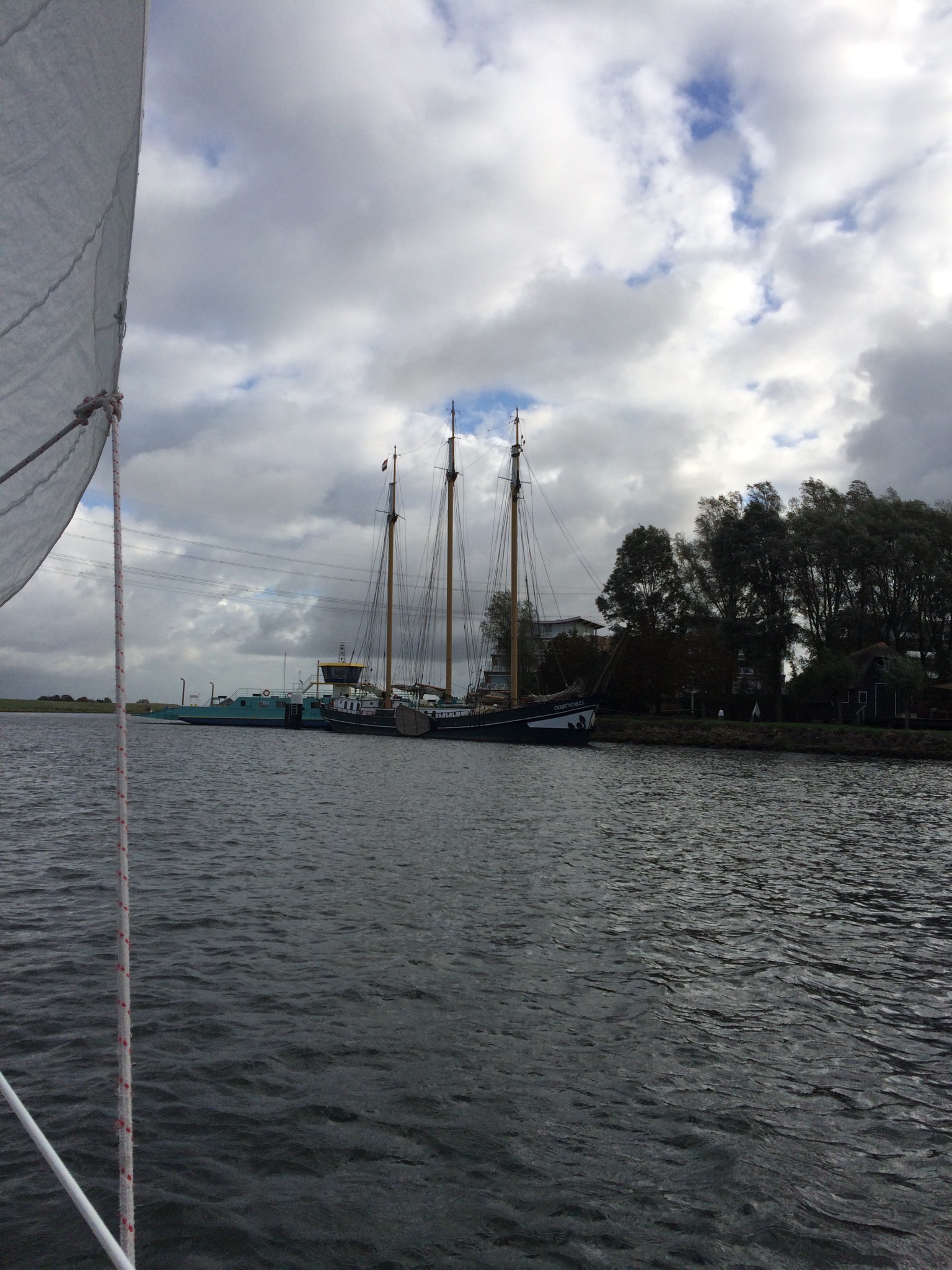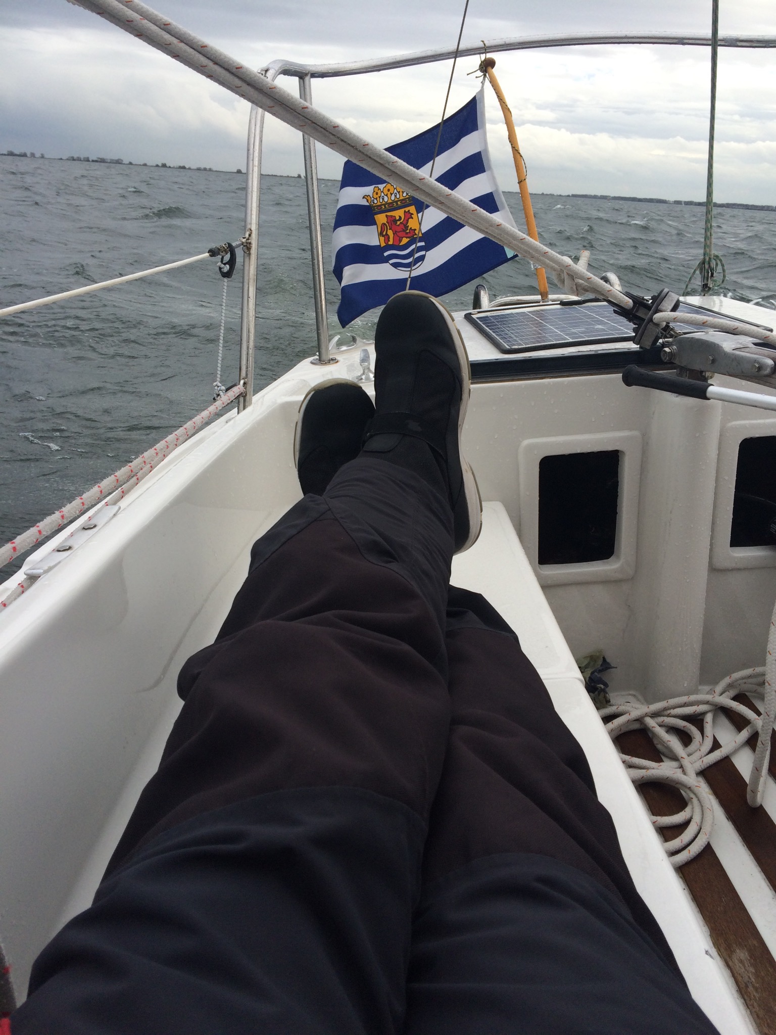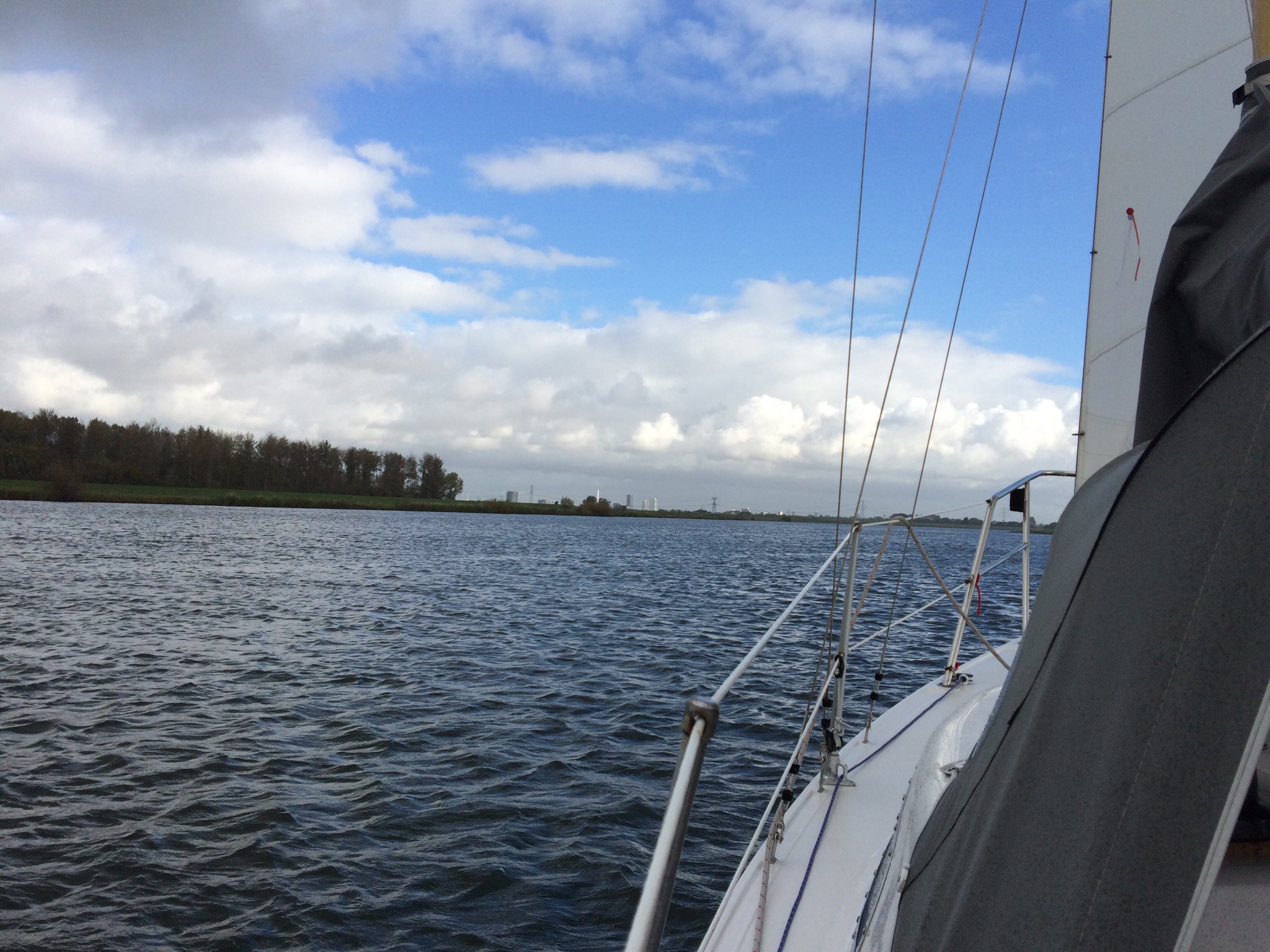 Het zeilen gaat fijn, en hard. We kregen het niet op de foto, maar af en toe liepen we 6 knopen. Dat is met dit tuig Hard! Ok, het helpt wel dat het ook Hard waait.