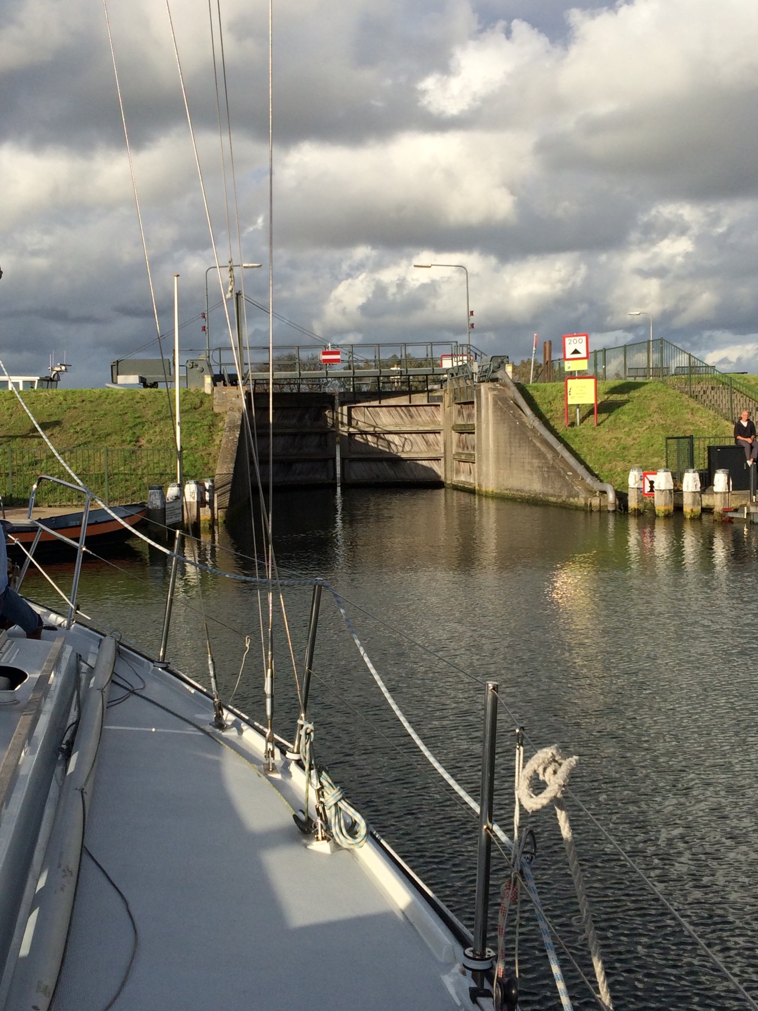 Na de Volkeraksluis kunnen we zeilen. Er is best wind, dus we reven het grootzeil en zetten de fok erop. Dat kan mooi in de sluis, lekker beschut.