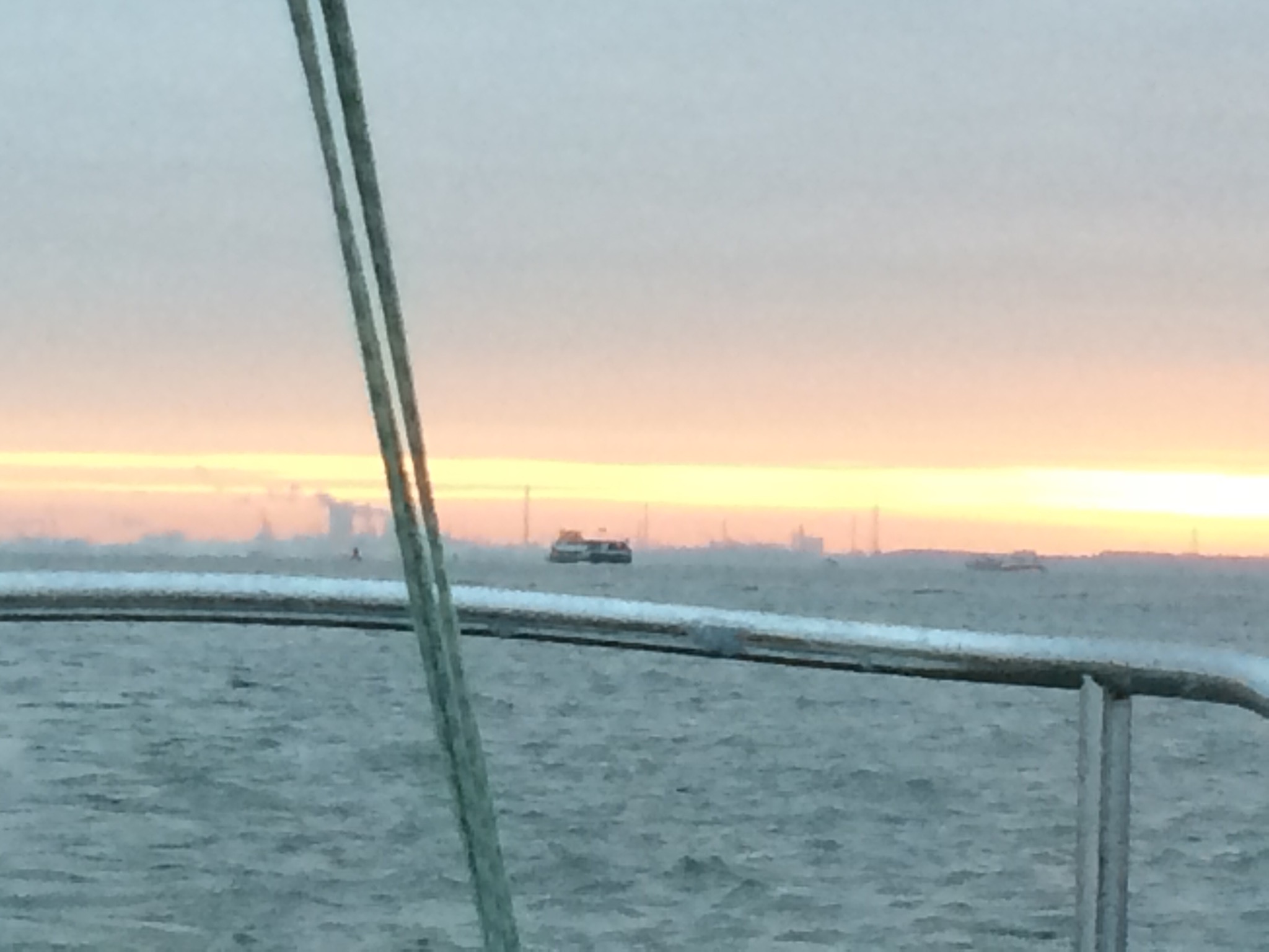 Als we buiten liggen schijnt de zon nog steeds. Schilderachtige silhouetten van de industrie bij Moerdijk.