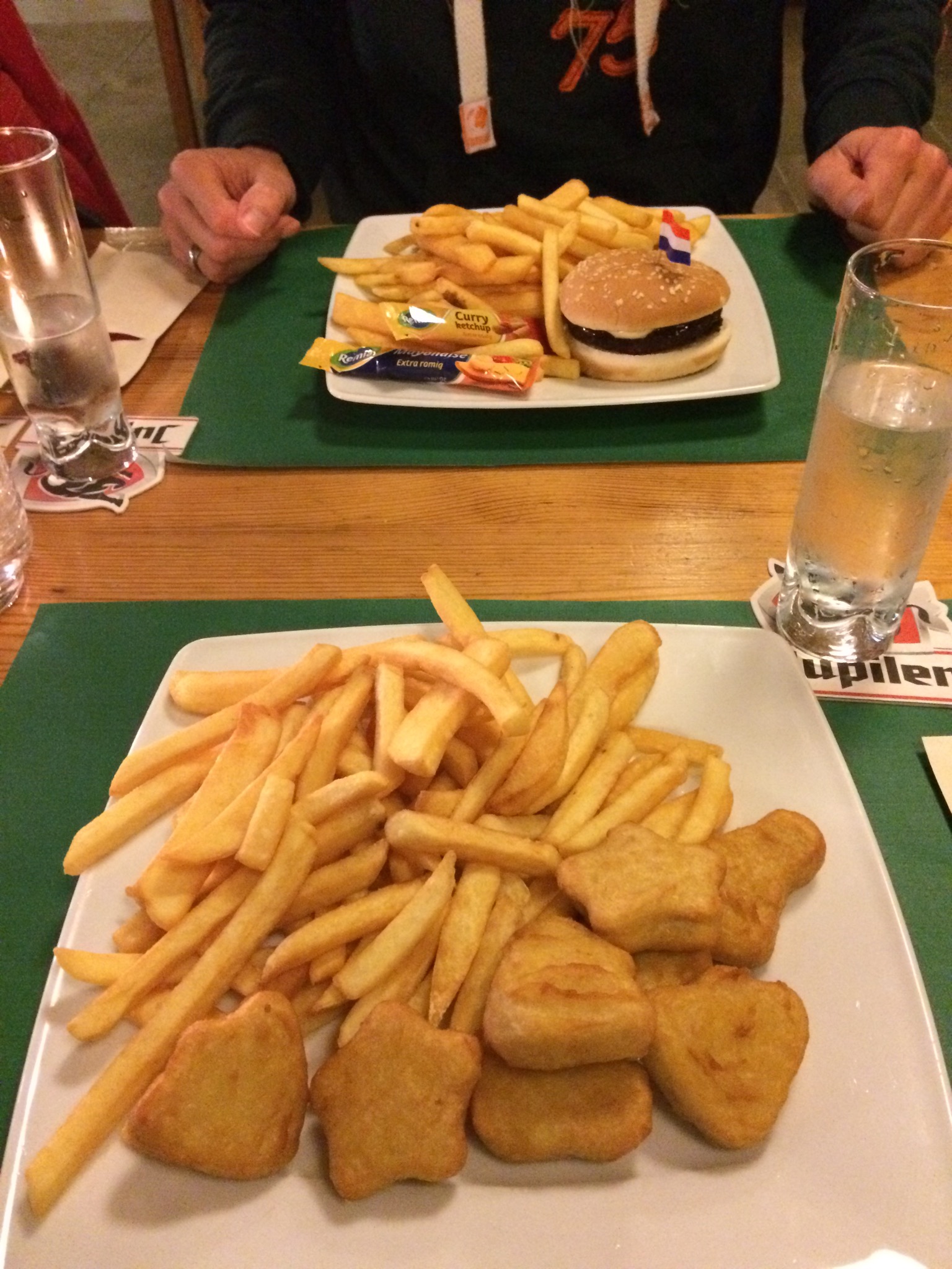We sluiten af met frietjes. Meneer K:)dootje krijgt zelfs een vlaggetje op zijn hamburger: