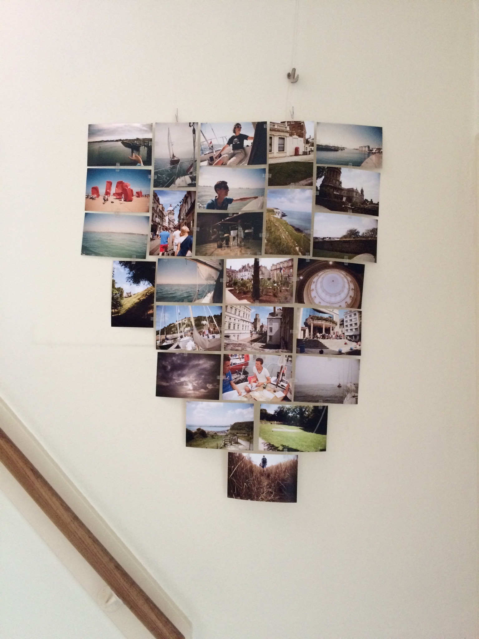 Er hing daar al een stukje schilderij-rails. Behalve de speciale draadjes en haken passen daar ook prima gordijnrunnertjes in. Met een stukje visdraad kun je daar dingen aan ophangen. In dit geval gebruikte ik paperclips als haakjes om de collage aan de visdraad te hangen.