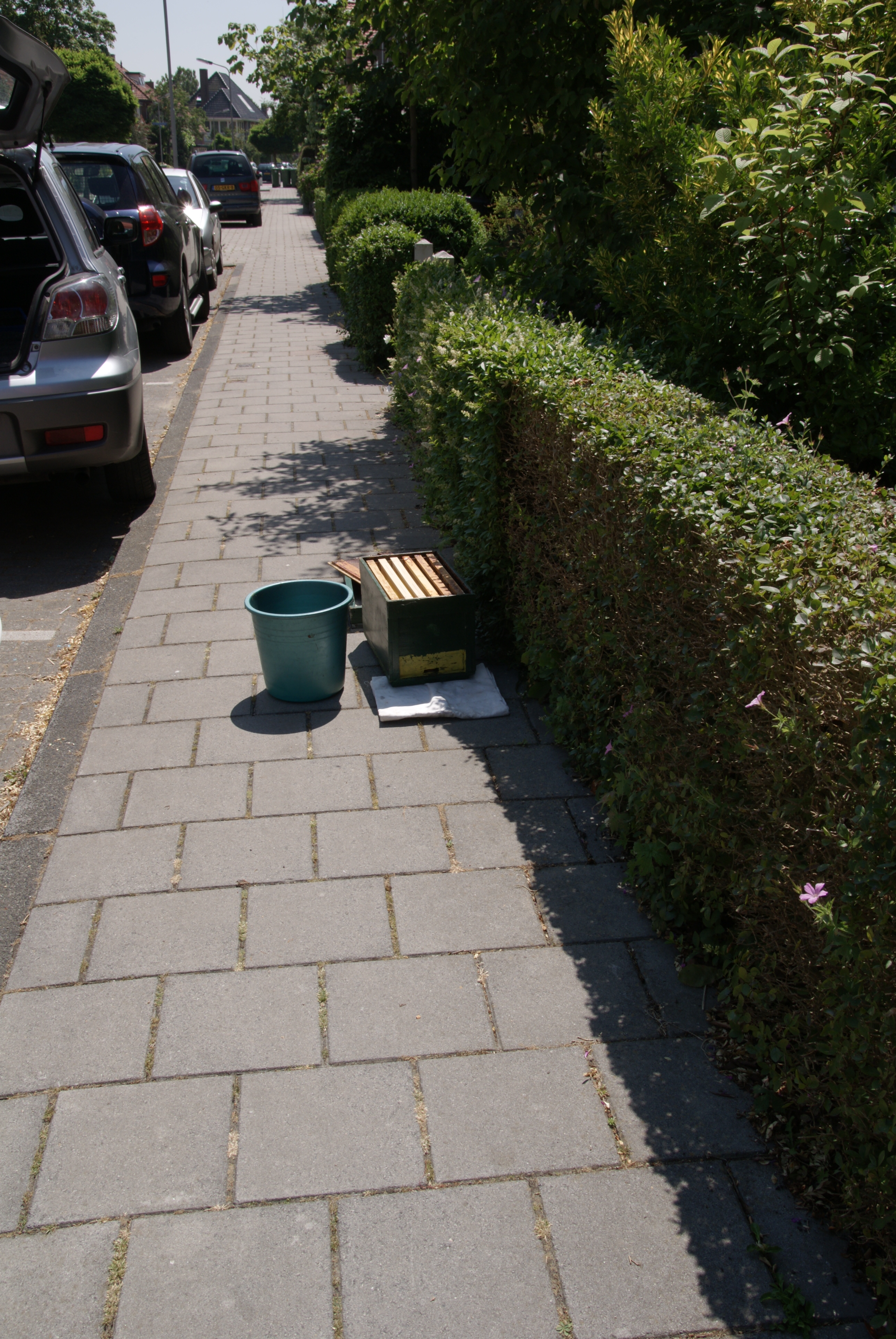 Deze bijen zijn kennelijk erg braaf, ze zitten ’s middags al vrijwel allemaal binnen. ’s Avonds heeft meneer Van der Scheer de kast weer opgehaald en de bijen verhuisd naar hun nieuwe stek.