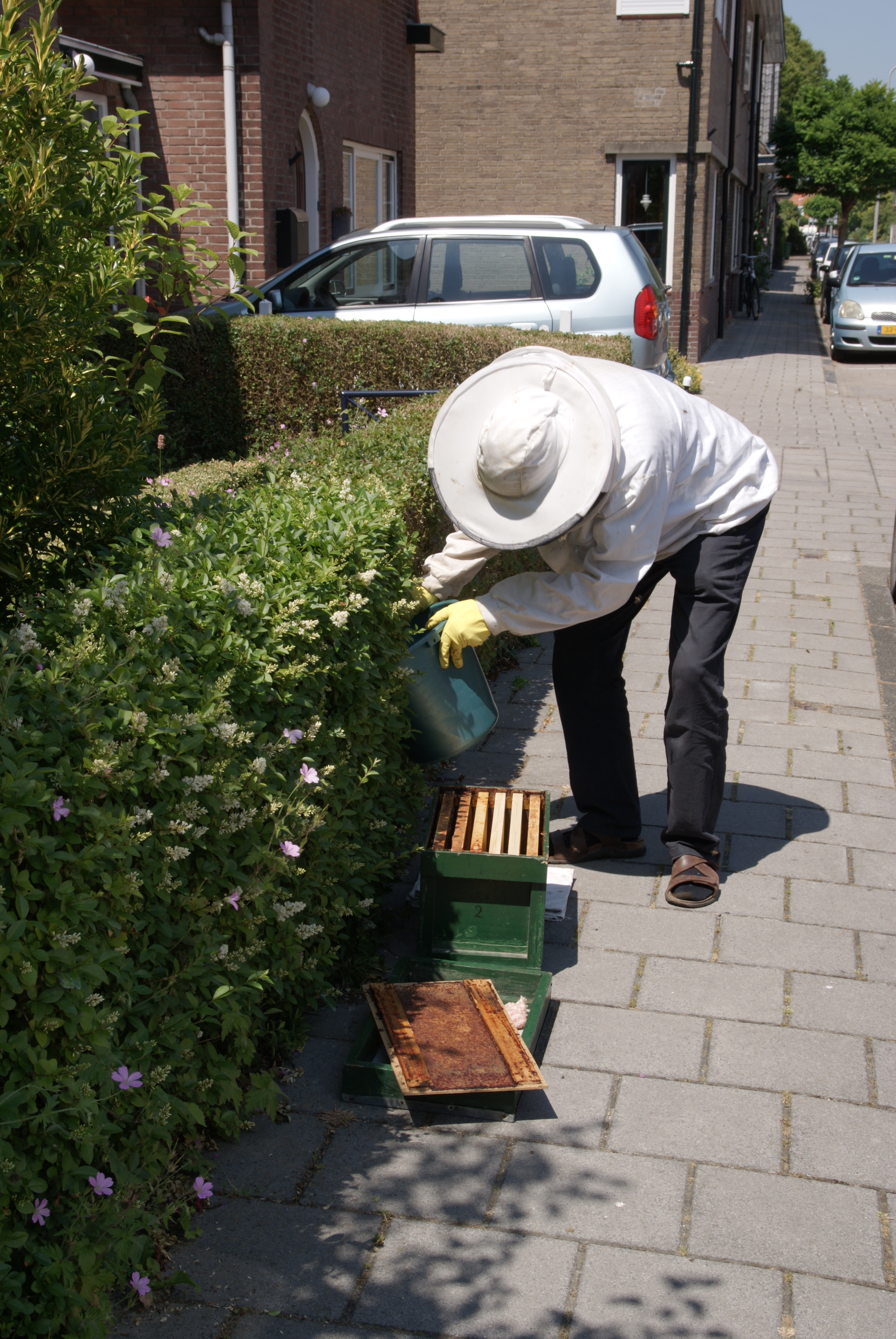 Daarna schudt hij de bijen uit de heg in een emmer.