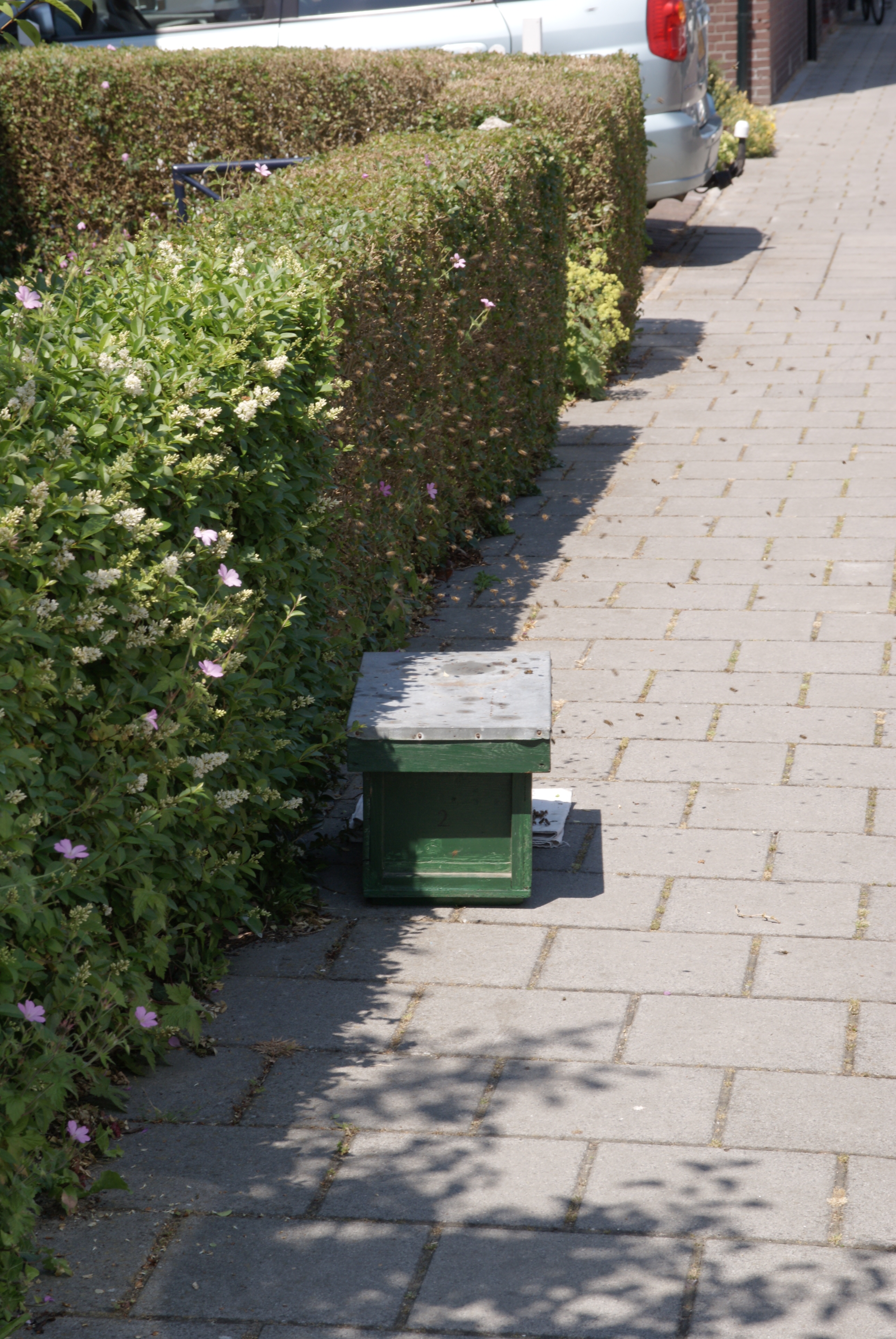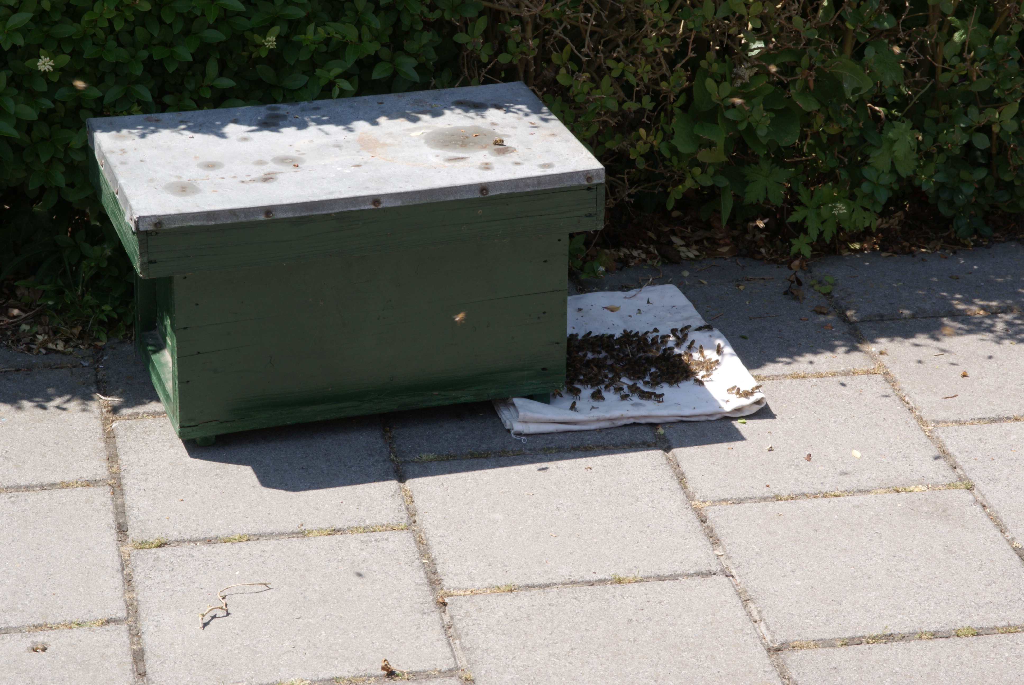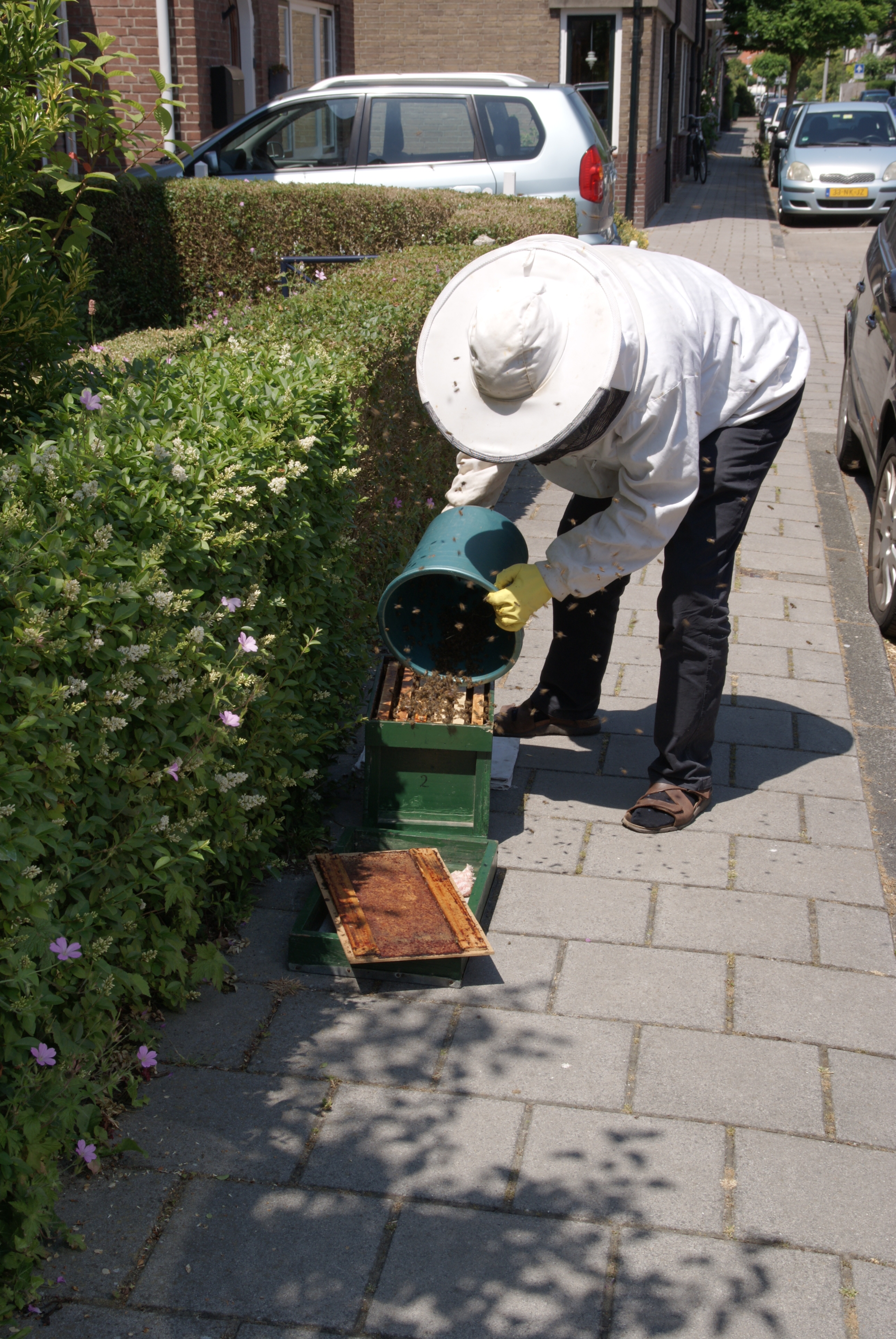 Als de koningin ook al in de kast zit zullen de andere bijen ook de kast in willen. Omdat er nog een aanzienlijk deel van de zwerm (een kleintje volgens de imker, zo’n 5000 bijen) in de heg is blijven plakken schudt hij die er nog uit en giet ze voor de kast. Ze beginnen meteen naar binnen te kruipen, dus het is vrijwel zeker dat de koningin al in de kast zit.
