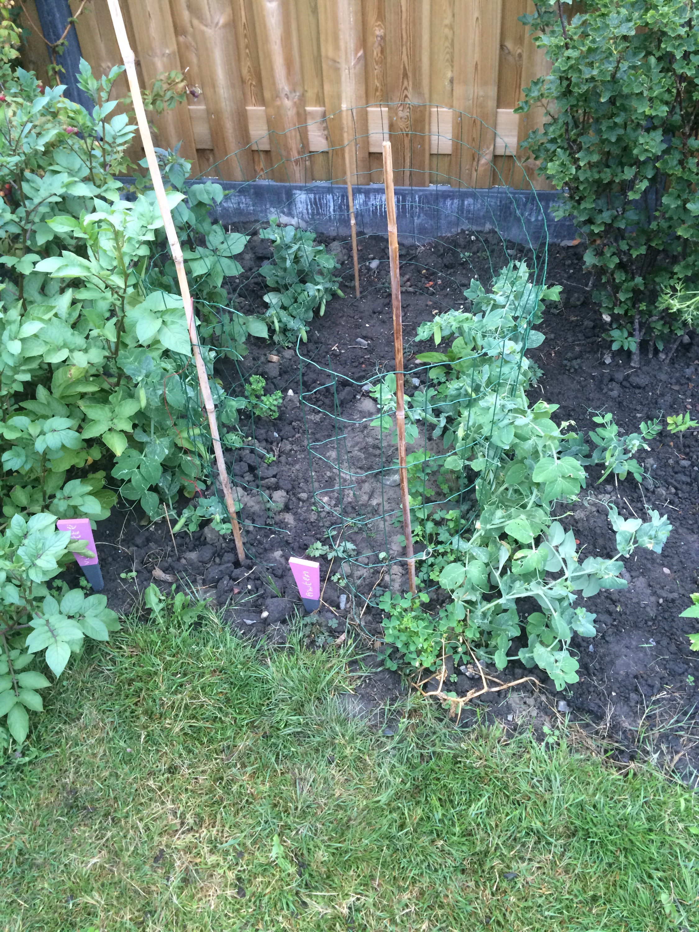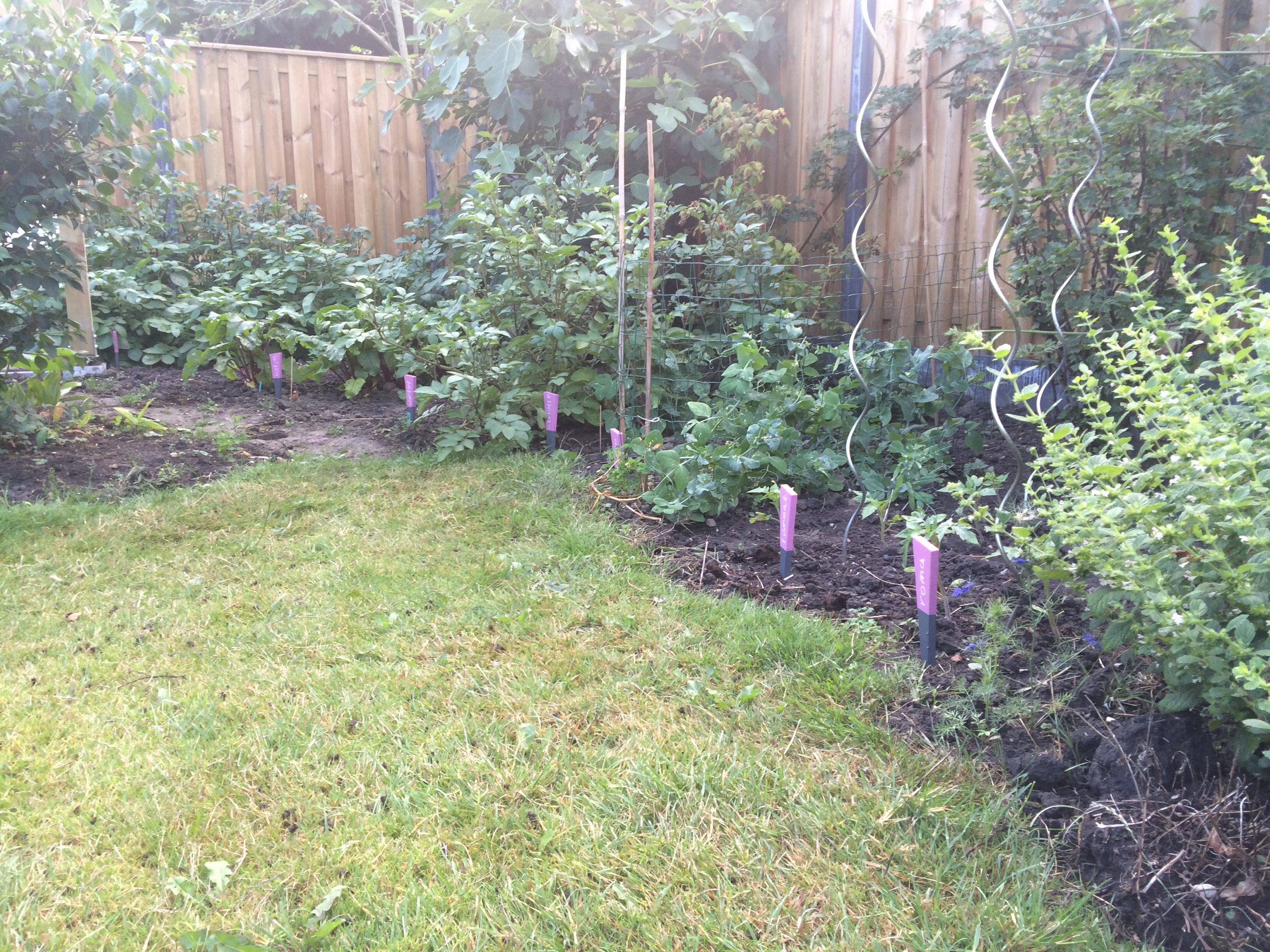 De pompoen neemt de ruimte. Ergens ertussen groeien nog twee selderieknollen. De aardappels zijn in elk geval boven de grond flink op dreef. Hopelijk doen ze onder de grond net zo hard hun best. Bietjes. Erwtjes. Die aten we vanavond, eigenlijk waren ze al aan de grote kant. Maar toch lekker. Weer een handje framboosjes.