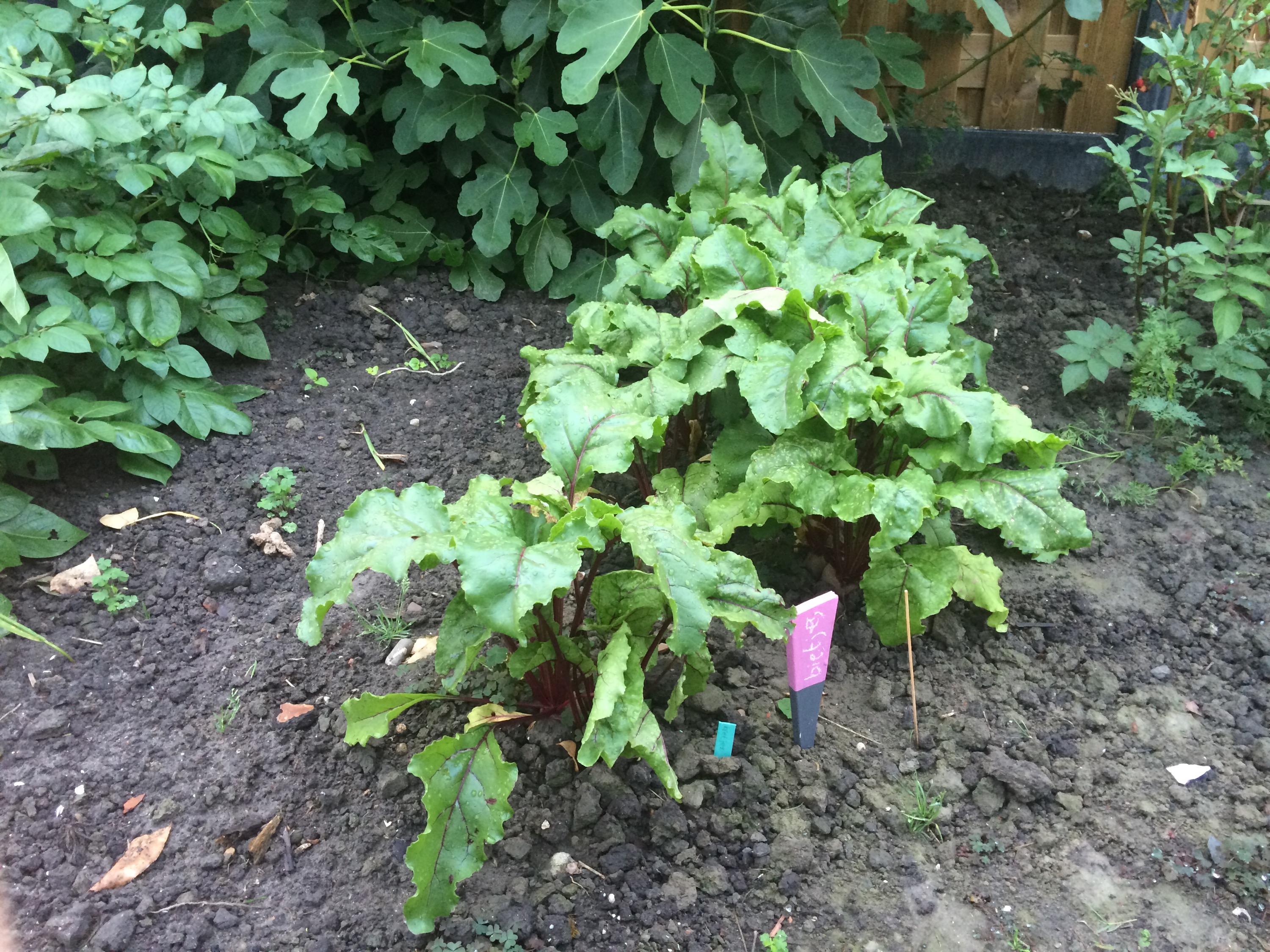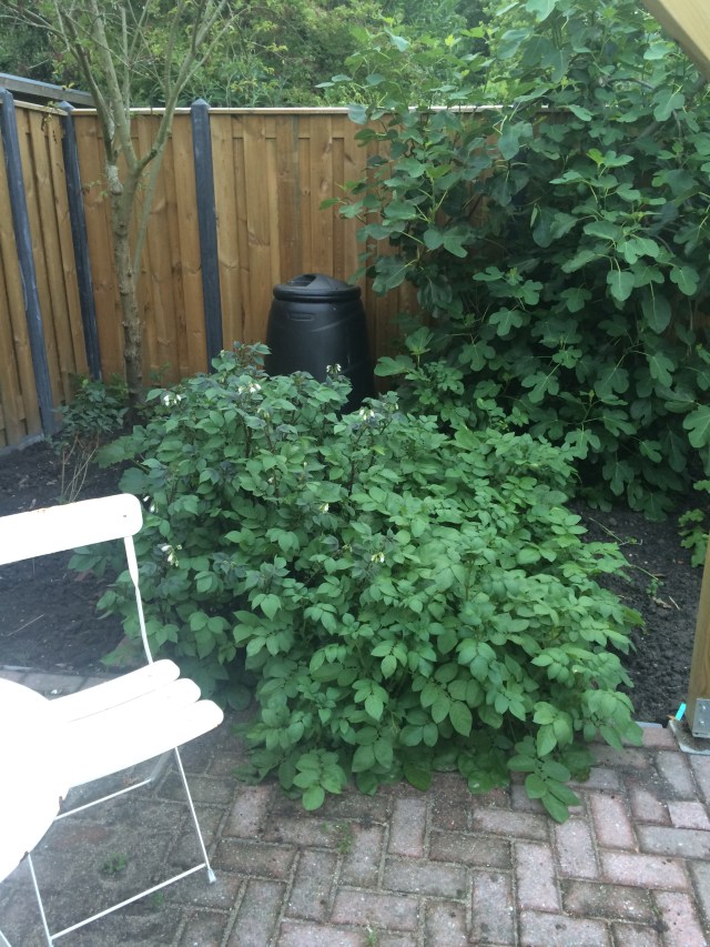 De worteltjes zijn aan een inhaalslag bezig en de vijgen zijn met héél veel maar nog niet rijp. De courgette lijkt het na een karige start nu ook goed naar zijn zin te hebben. De braam is vastbesloten in één seizoen weer net zo groot te worden als hij was voordat hij tot de grond afgeknipt werd in verband met de nieuwe schutting, maar dat gaat ten koste van de bramen zelf. Volgend jaar hopelijk weer.