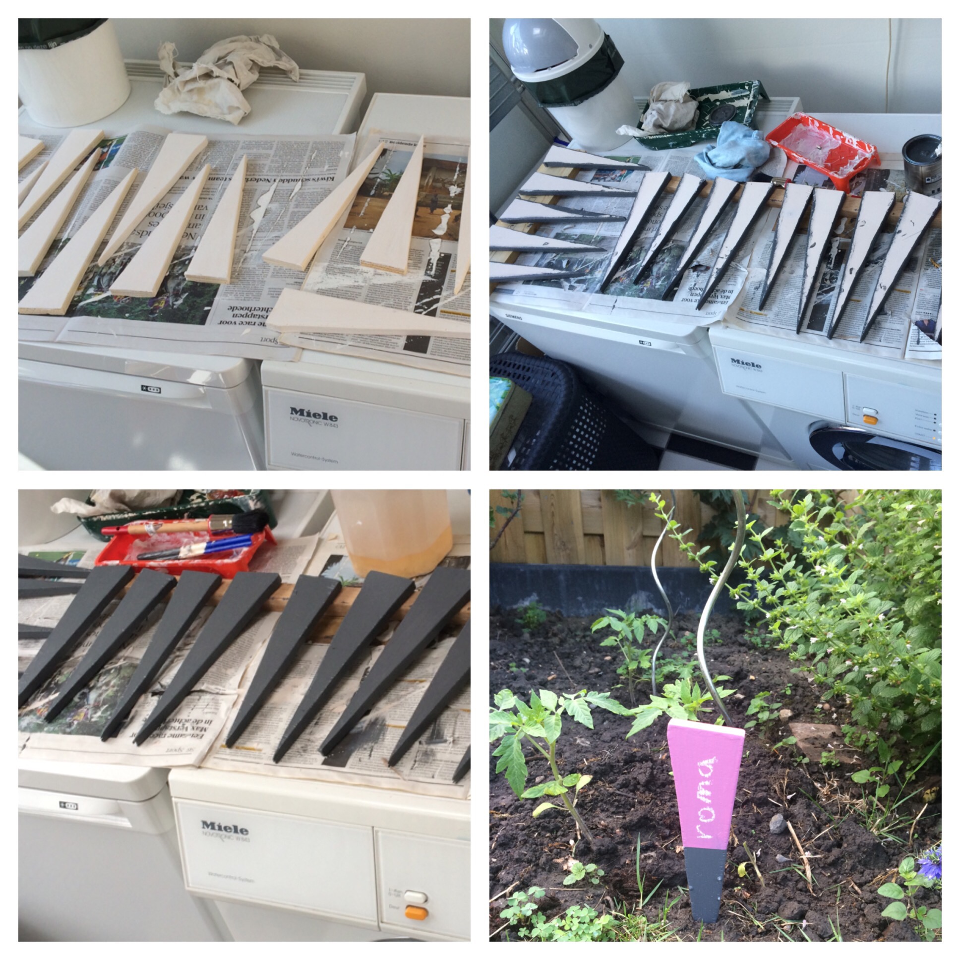 Hoewel je nu natuurlijk in één oogopslag kunt zien wat wat is, is dat niet altijd het geval. De afgelopen weken maakte ik daarom bordjes voor in de tuin. Die kleine groene plastic stekertjes raak ik altijd kwijt. Ik ga er eens op staan, of ik schoffel ze weg. Of meer van dat soort handigs.