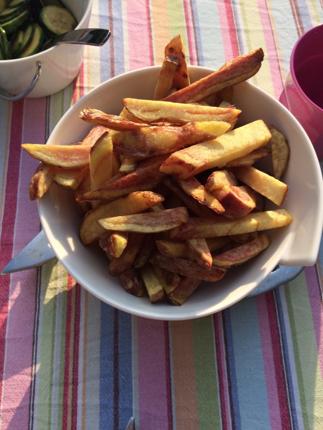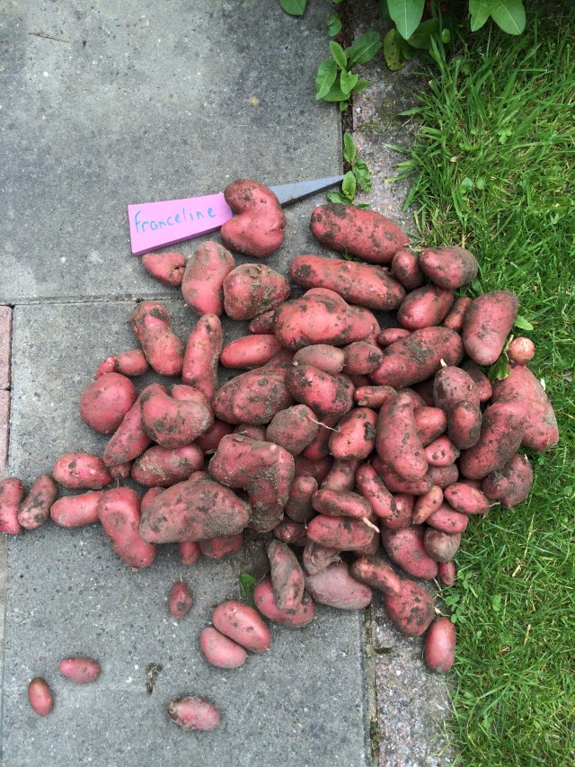 Dit is de oogst van vijf (of zes?) pootaardappels die ik van een vriendin kreeg. We kunnen dus even vooruit. En dat terwijl de Vitelotte Noir nog in de grond zit.