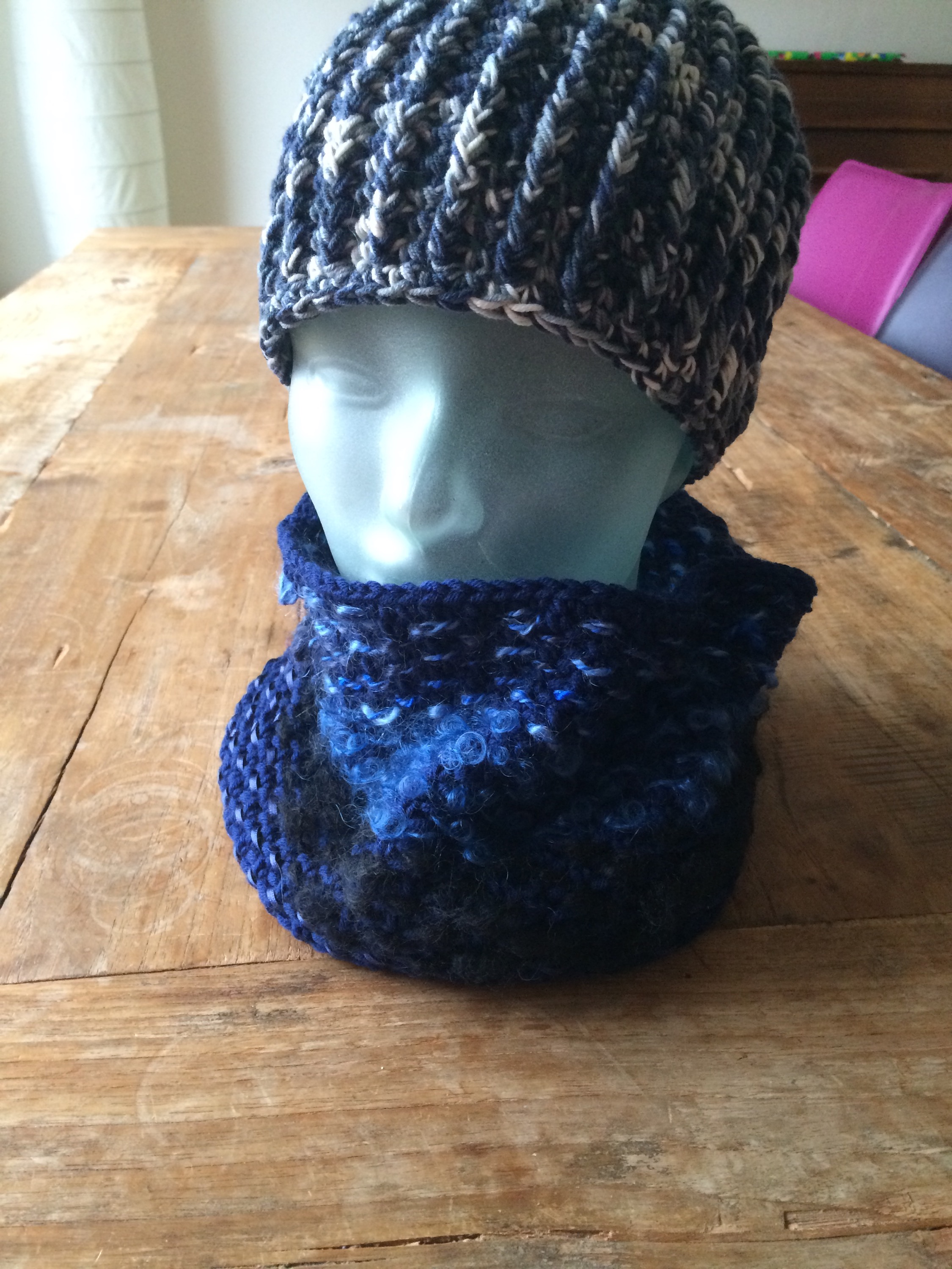 In elk geval: het werd een col, hij is heerlijk zacht en warm, de onbreibare wol is nog maar voor de helft op, de blauwe wol voor meer dan de helft, ik moet nodig weer naar de wolwinkel, het is weer voor warme dingen en mijn andere projecten voelen zich achtergesteld.