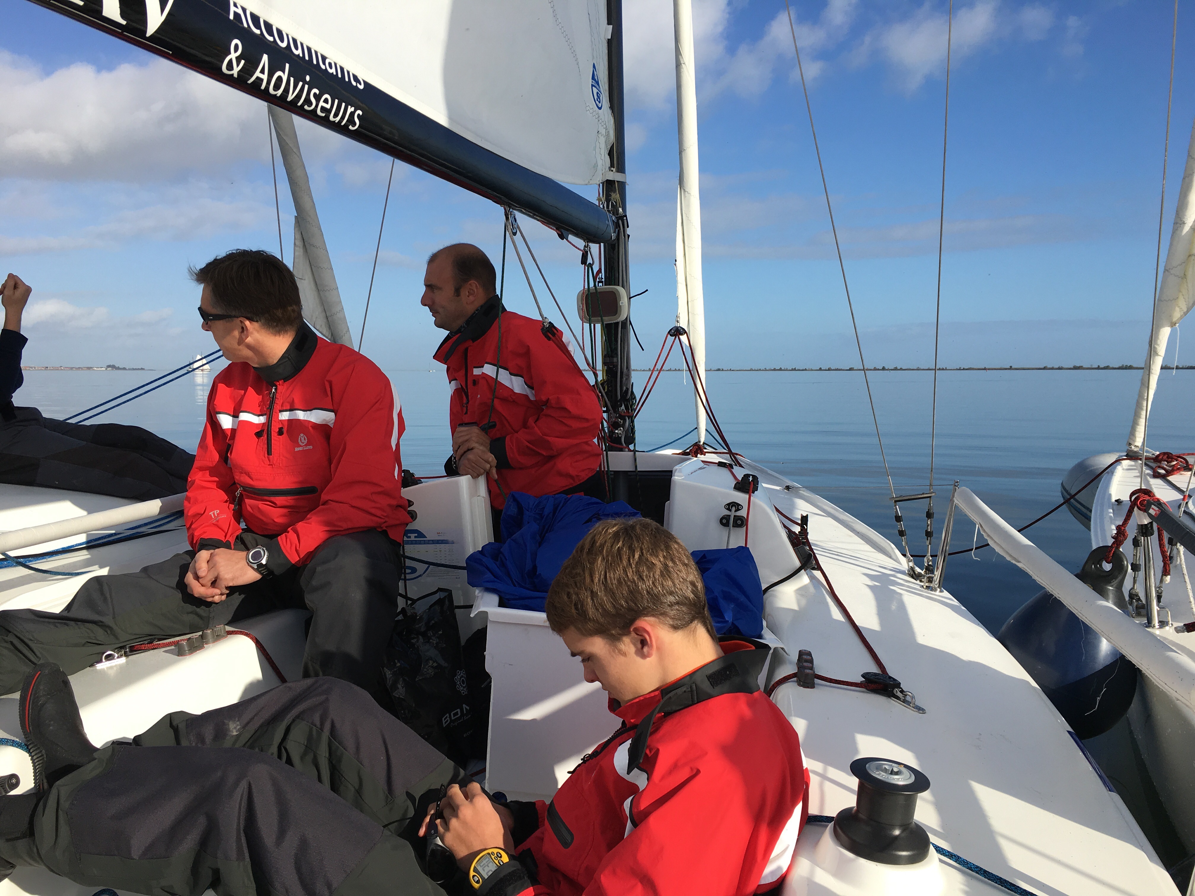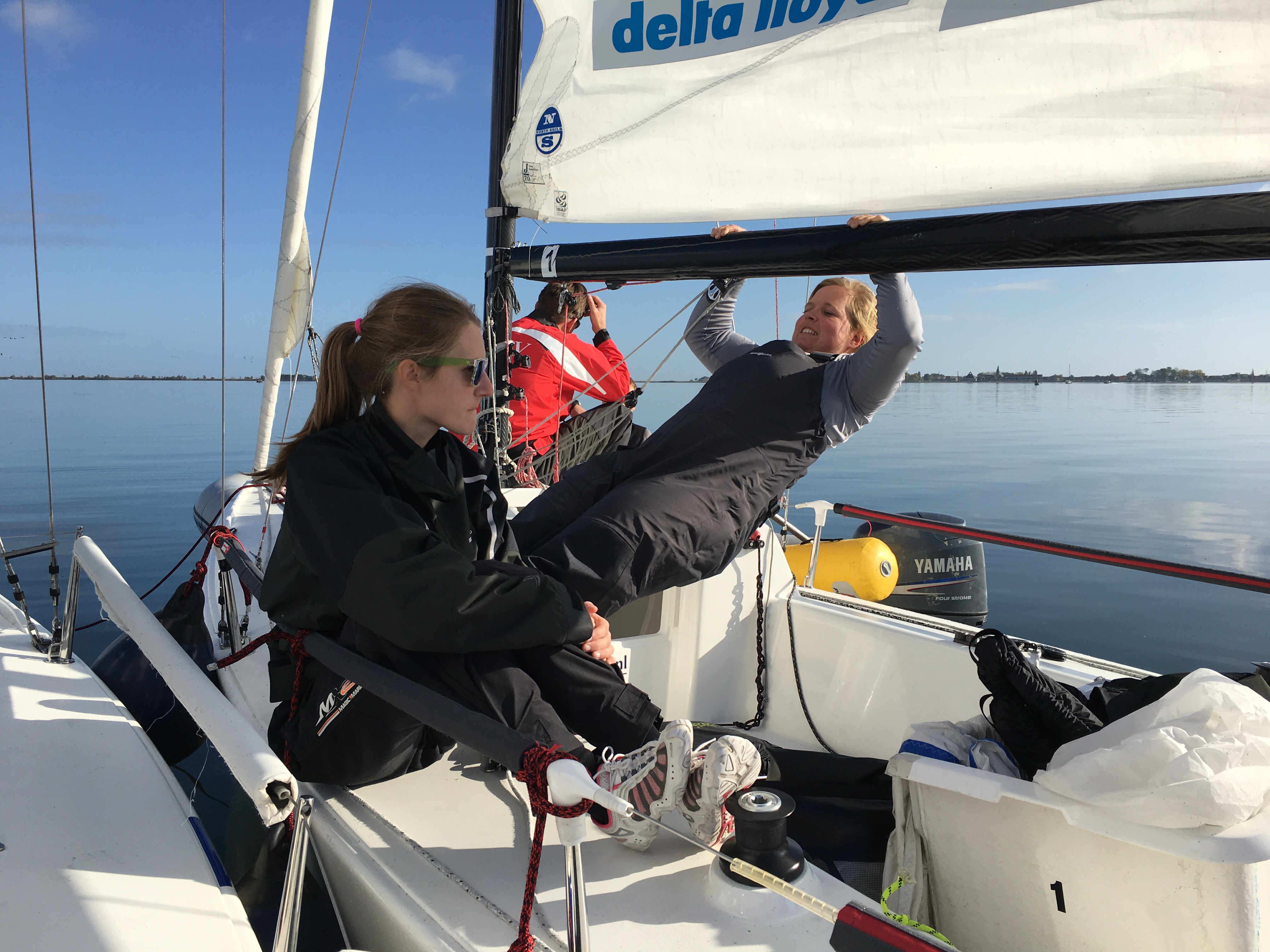 En toen ging het dan toch nog genoeg waaien om een klein beetje te kunnen zeilen. Niet veel, maar we gingen vooruit. We trainden vooral op het sturen met gewicht en zeilen en zo weinig mogelijk met het roer. Zinvol.