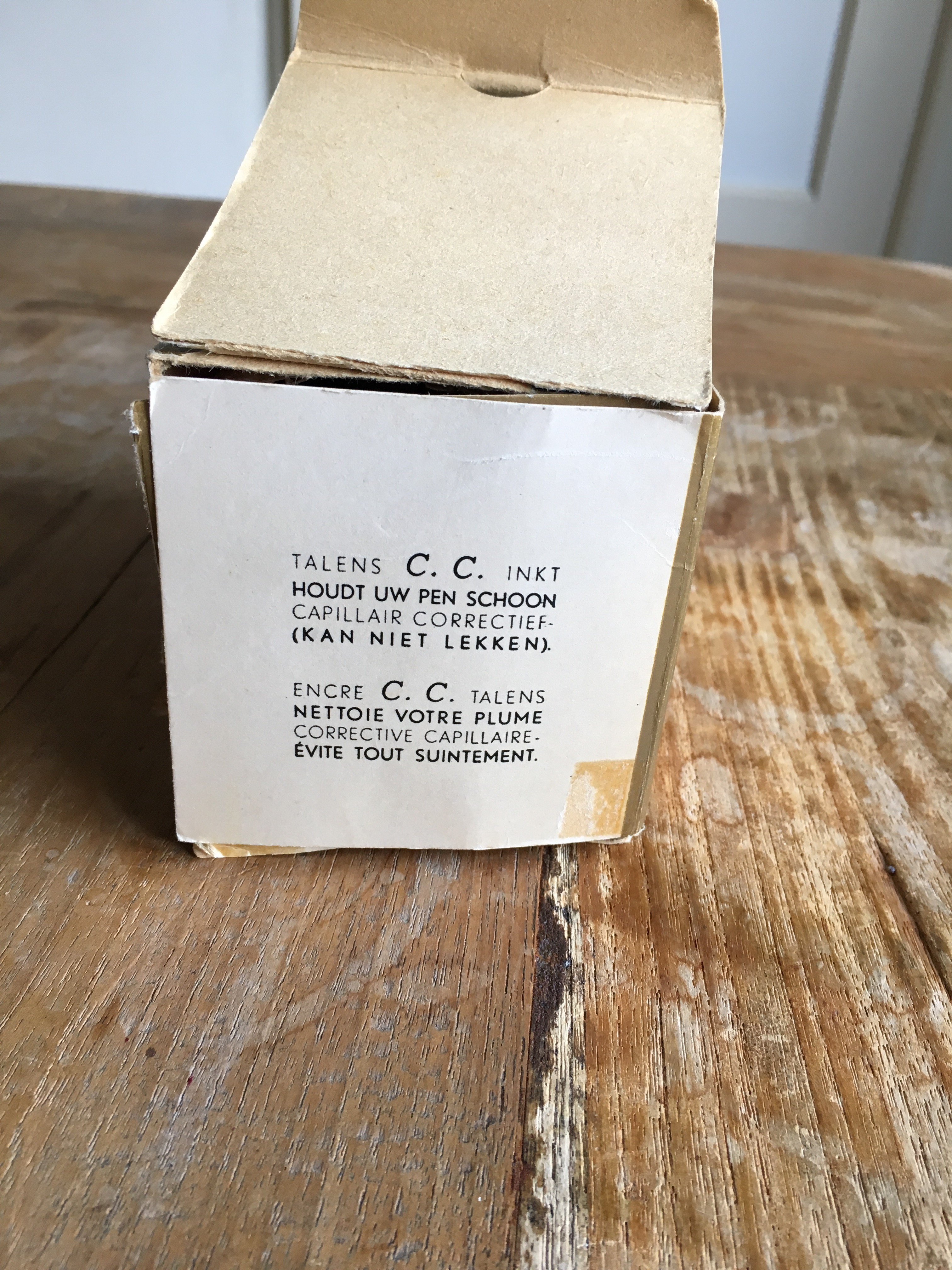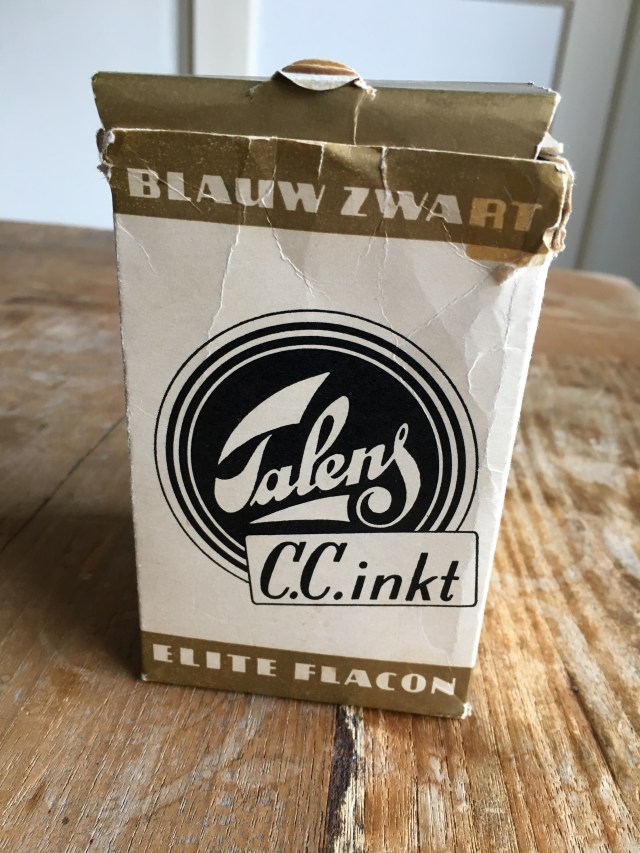 Twee flessen ouderwetse Talens vulpeninkt, waarvan één nog in het originele doosje.