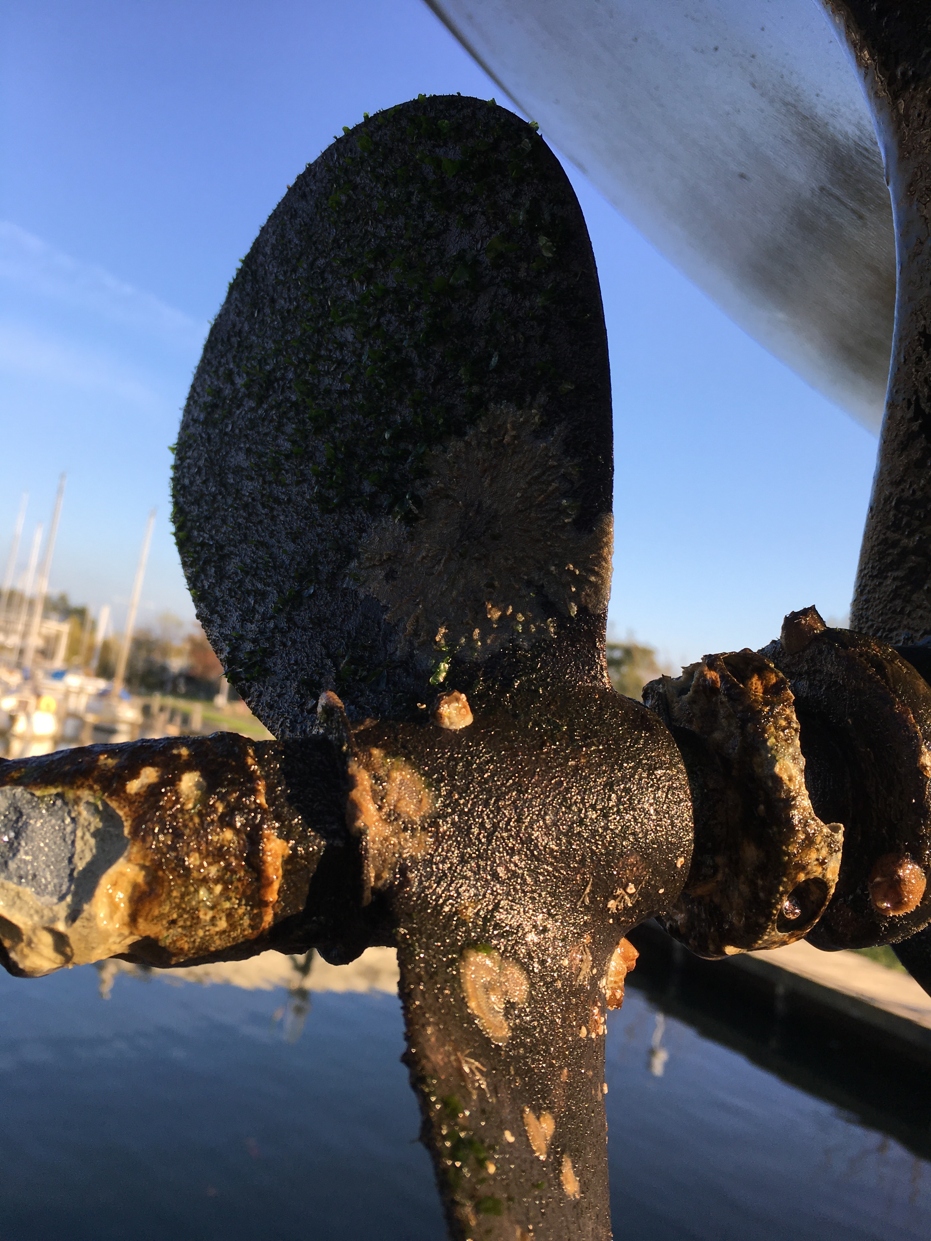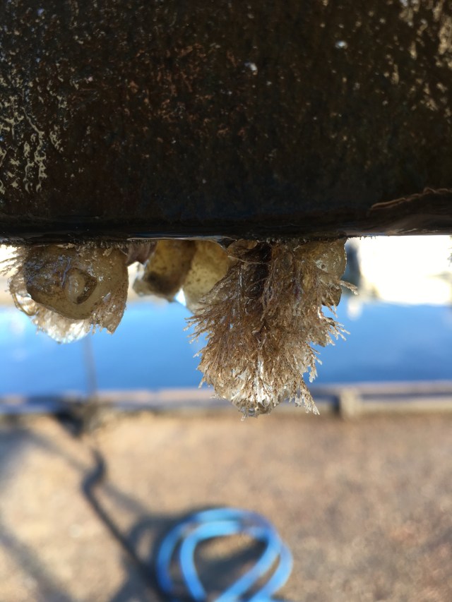Ondanks de antifouling (aangroeiwerende verf) groeit er altijd wel íets op het onderwaterschip. Dit jaar groeide er, onder andere, iets aan de onderkant van het roer. Mooi hè? Geen idee wat het precies was, overigens.