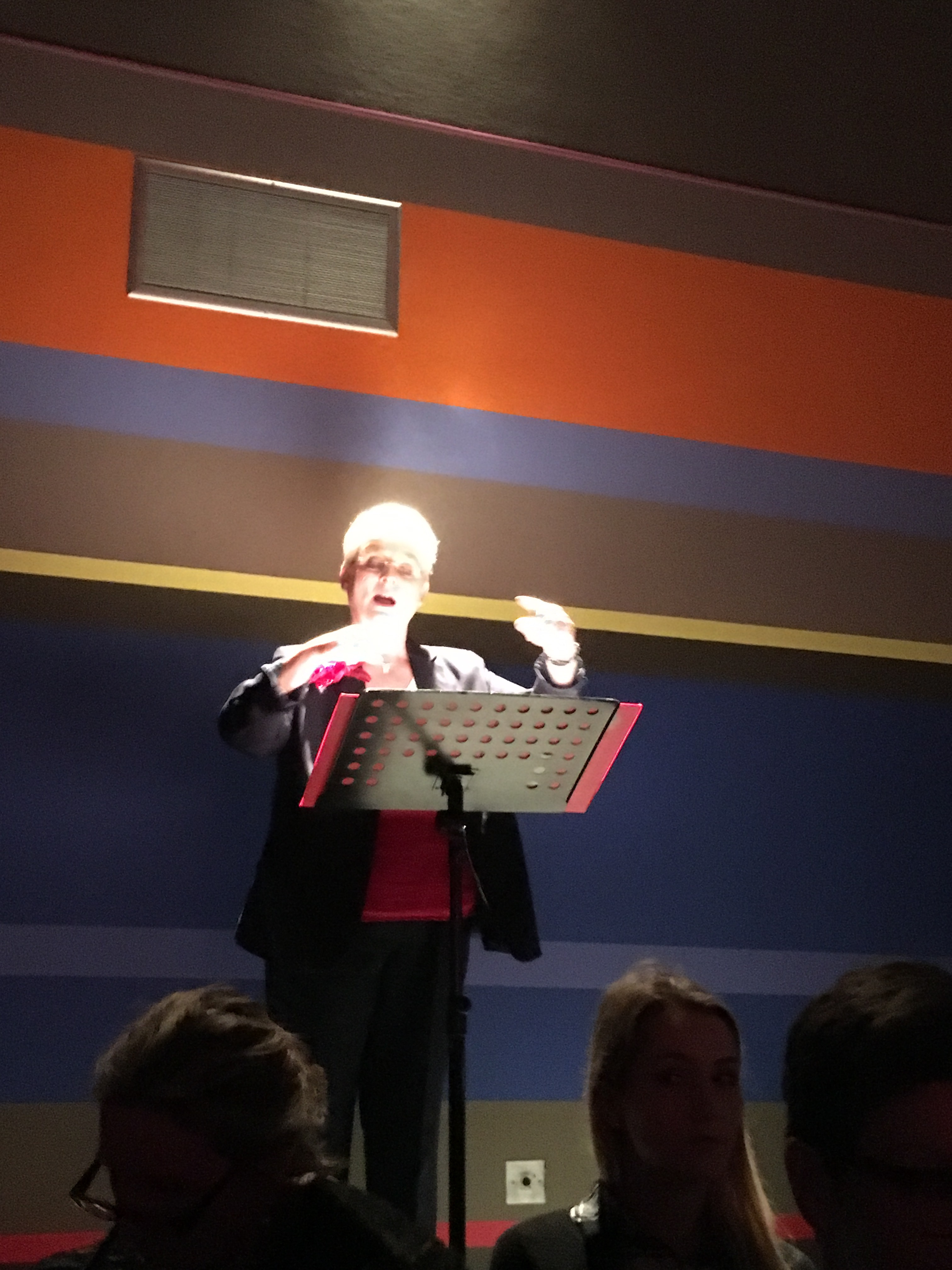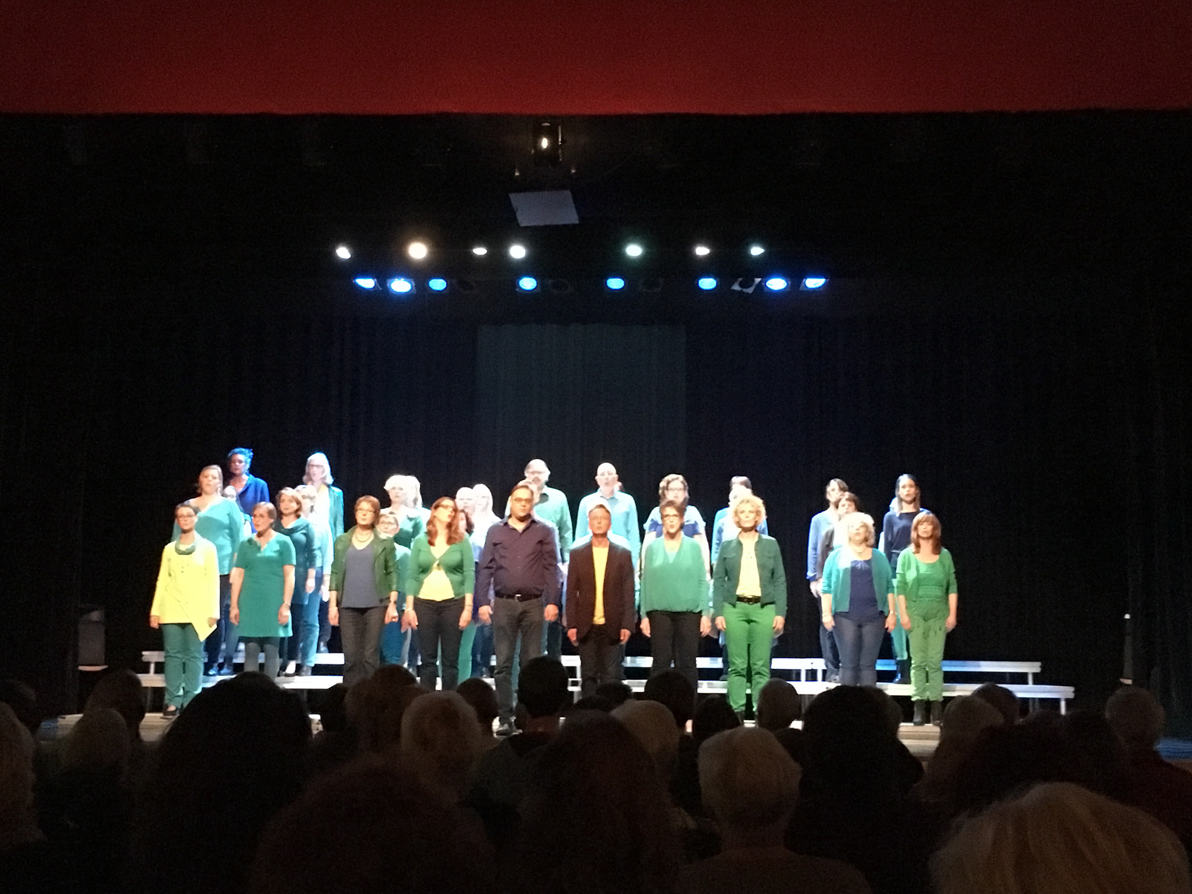 Wat ik dan altijd leuk vind om te zien: de dirigente, Francis de Jonge, stond ook op een podium(pje), helemaal achterin de zaal. Ook keurig in de juiste kleuren (de foto is dus van voor de pauze):