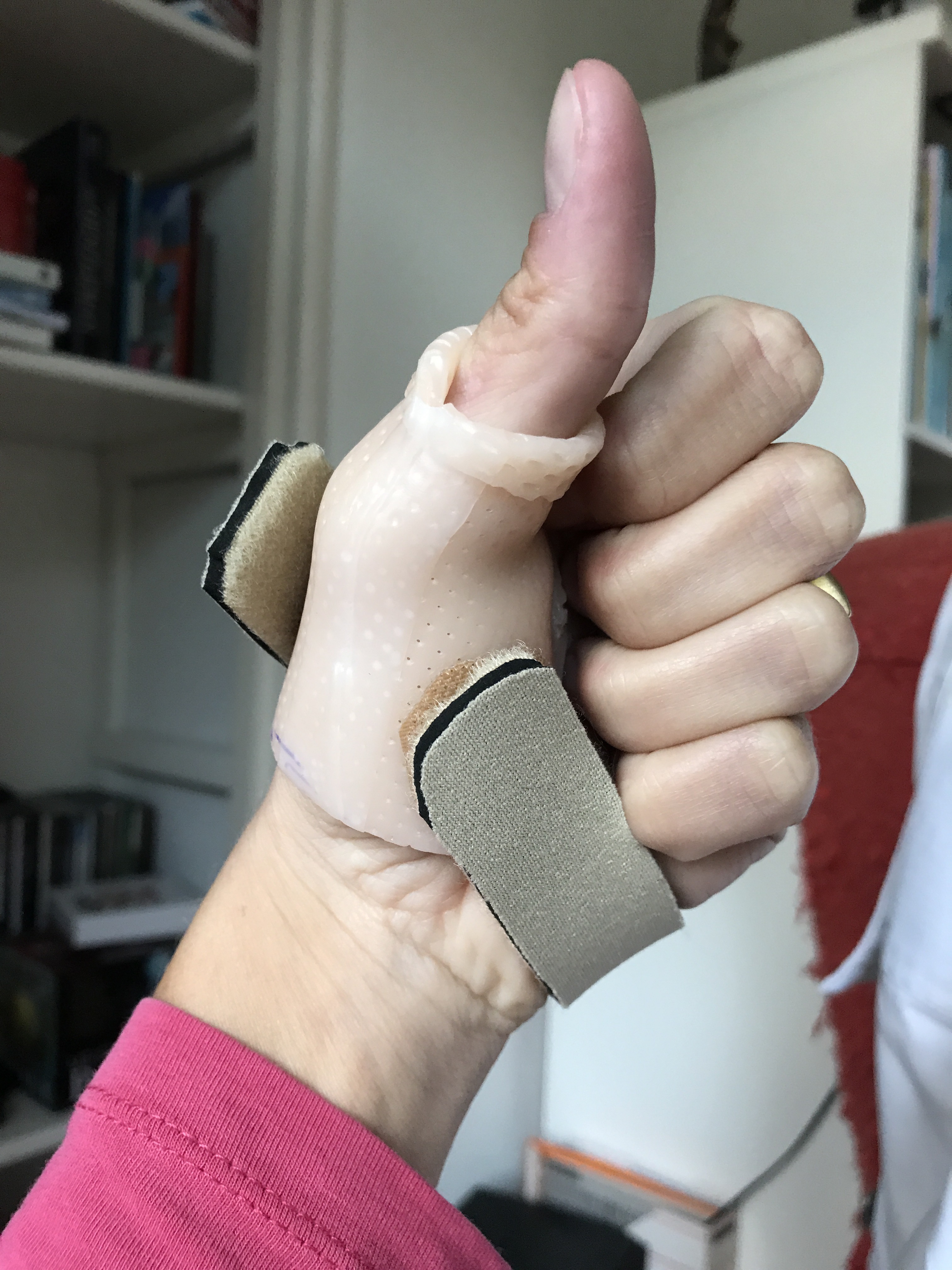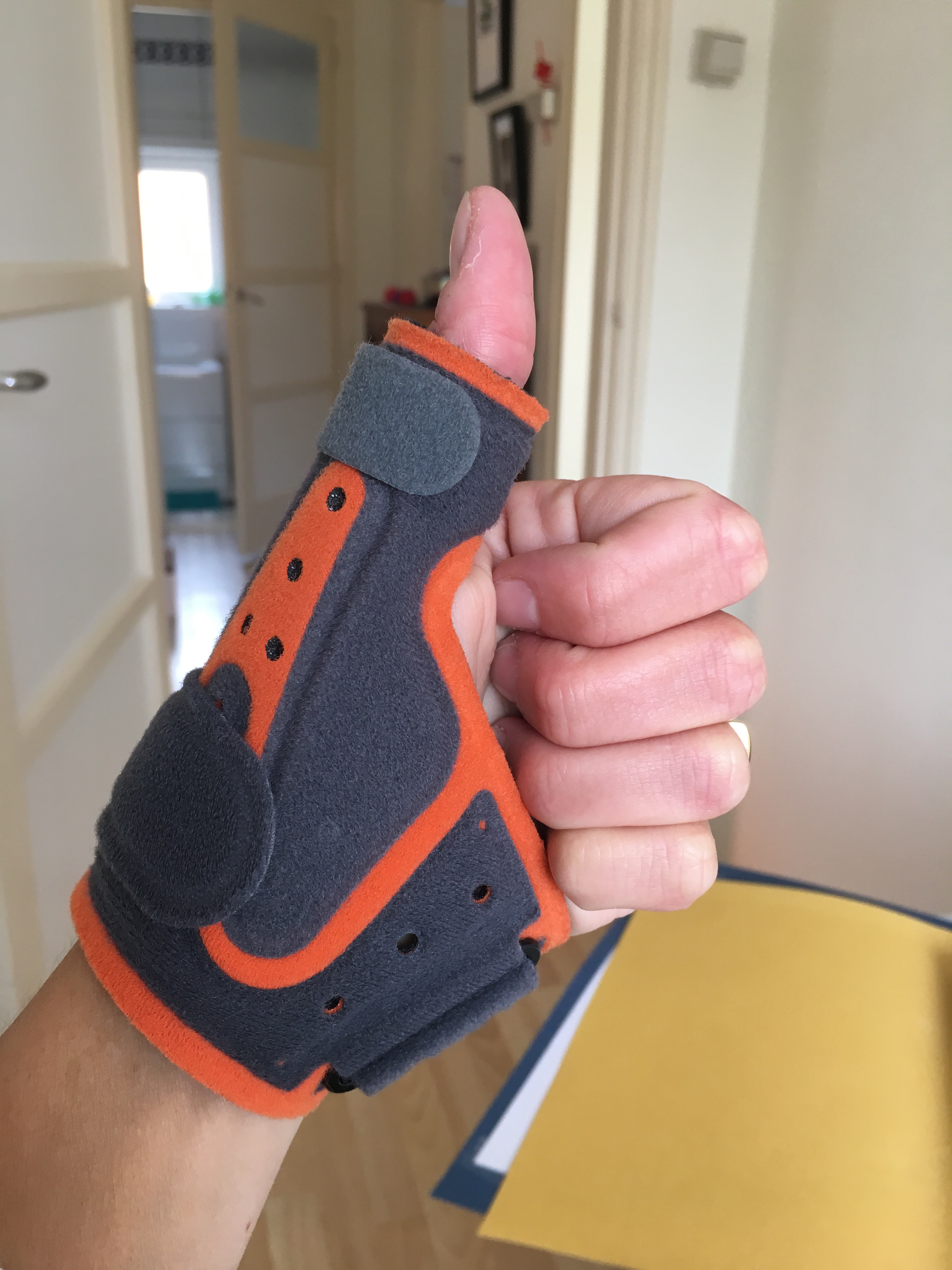 Voorlopig heb ik weer een andere spalk. Want de vorige voldeed onvoldoende. Handig, te beweeglijke duimen.