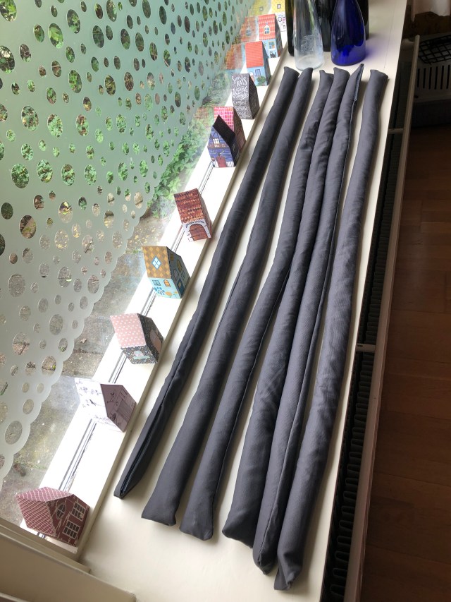 Enige tijd geleden belde mijn vriendin op: of ik ook dingen op bestelling maak. En zo ja, of ik dan ideeën had voor tochtrollen voor hun schuiframen. Natuurlijk, ideeën te over. Praktische uitvoerbaarheid beperkte mijn gedachtenchaos gelukkig wat. Haken, breien, naaien, kleuren, materialen: nog steeds mogelijkheden te over. Gelukkig had zij wat wensen qua kleuren en dergelijke, dus kwam ik uit op naaien en donkergrijs.