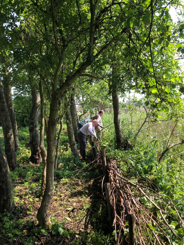 Na een eerste inspectie werd de taakverdeling gemaakt: de heren gingen bouwen (want ja, dat was met gereedschap, dús voor jongens, kennelijk) en de dames sjouwen. Takkenbezems zijn een vrouwending, kennelijk.