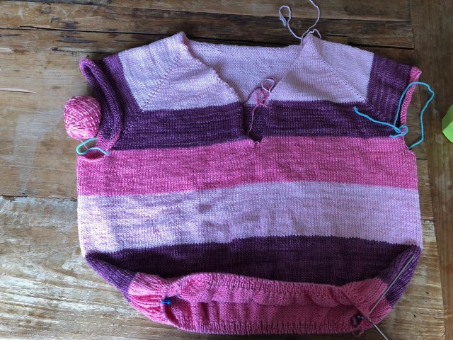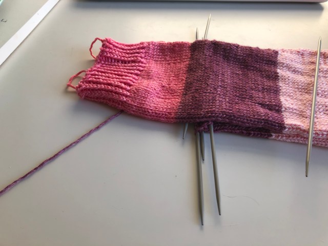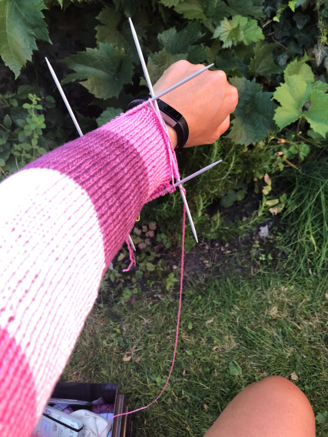 De ROZE was het verst op, en daar moest ik het laatste stuk mee breien. Dus het bleef spannend.