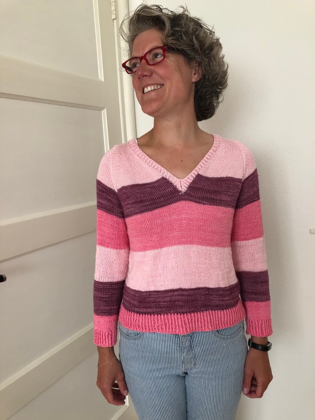 Twee (?) jaar geleden ging ik weer breien. Dat kon natuurlijk ook met dat garen! Een trui met een V-hals, met strepen. Dat was wel wat.
