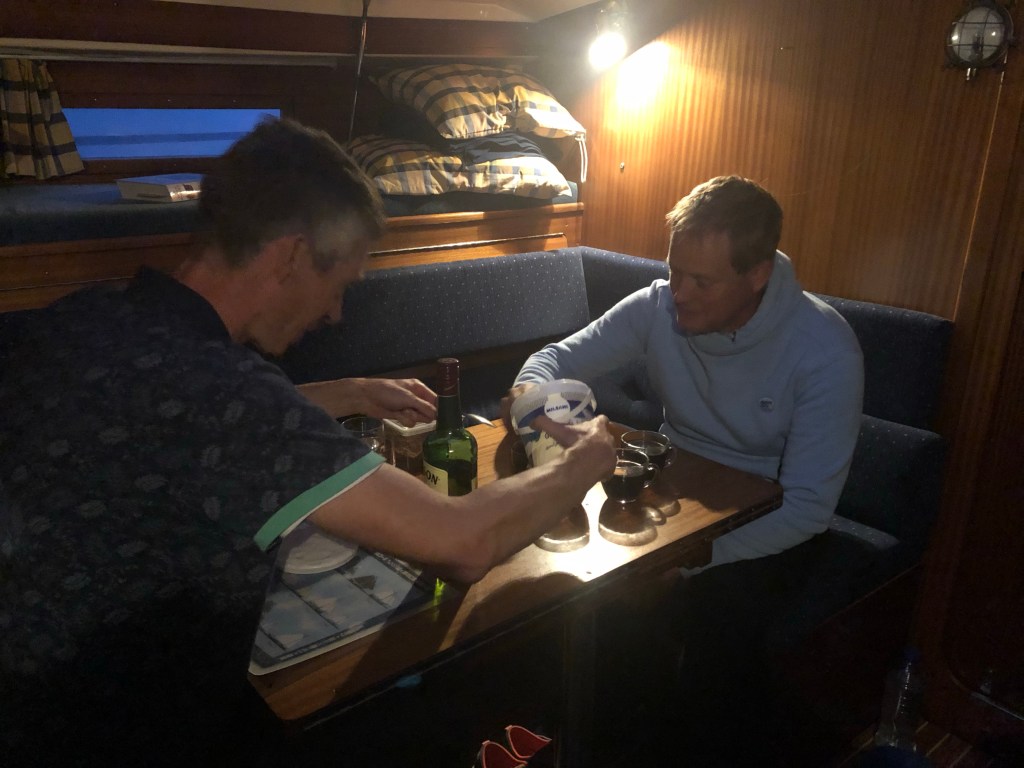 Intussen kan degene die ofwel wacht tot het water kookt, ofwel tot de whiskey klaar geroerd is, de slagroom schudden. Schudden? Ja. Daar heb je geen mixer en dus geen 220V voor nodig. Best handig aan een eilandje in de Grevelingen, bijvoorbeeld.