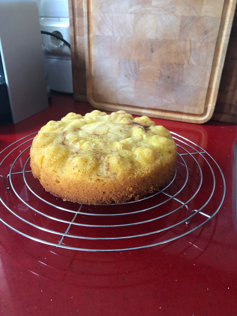Brand je mond niet aan de hete appel als je de cake niet laat afkoelen als hij uit de oven komt (hij is trouwens gaar als een saté-prikker die je erin steekt en schoon uit komt, dus zonder nat beslag eraan).