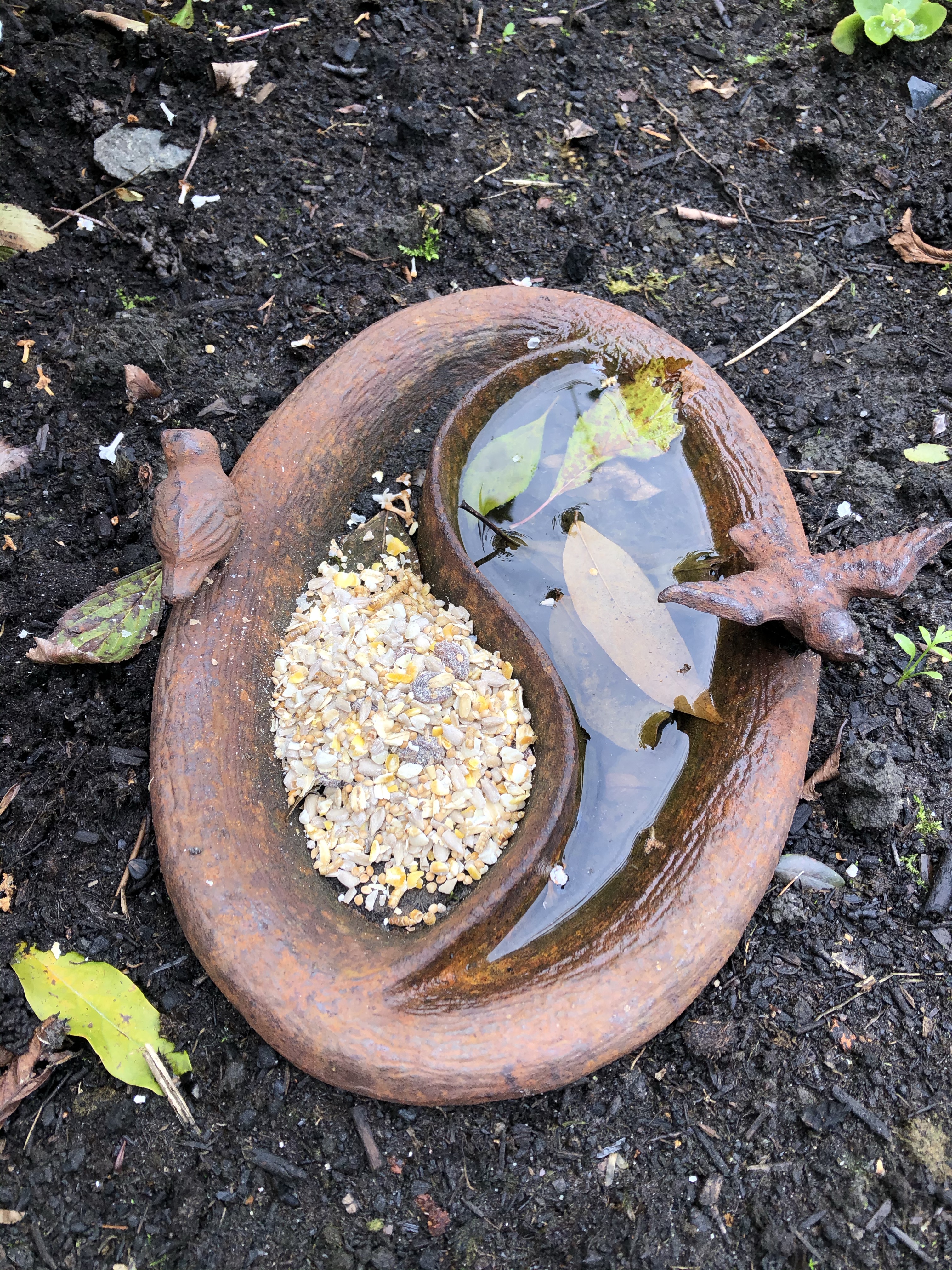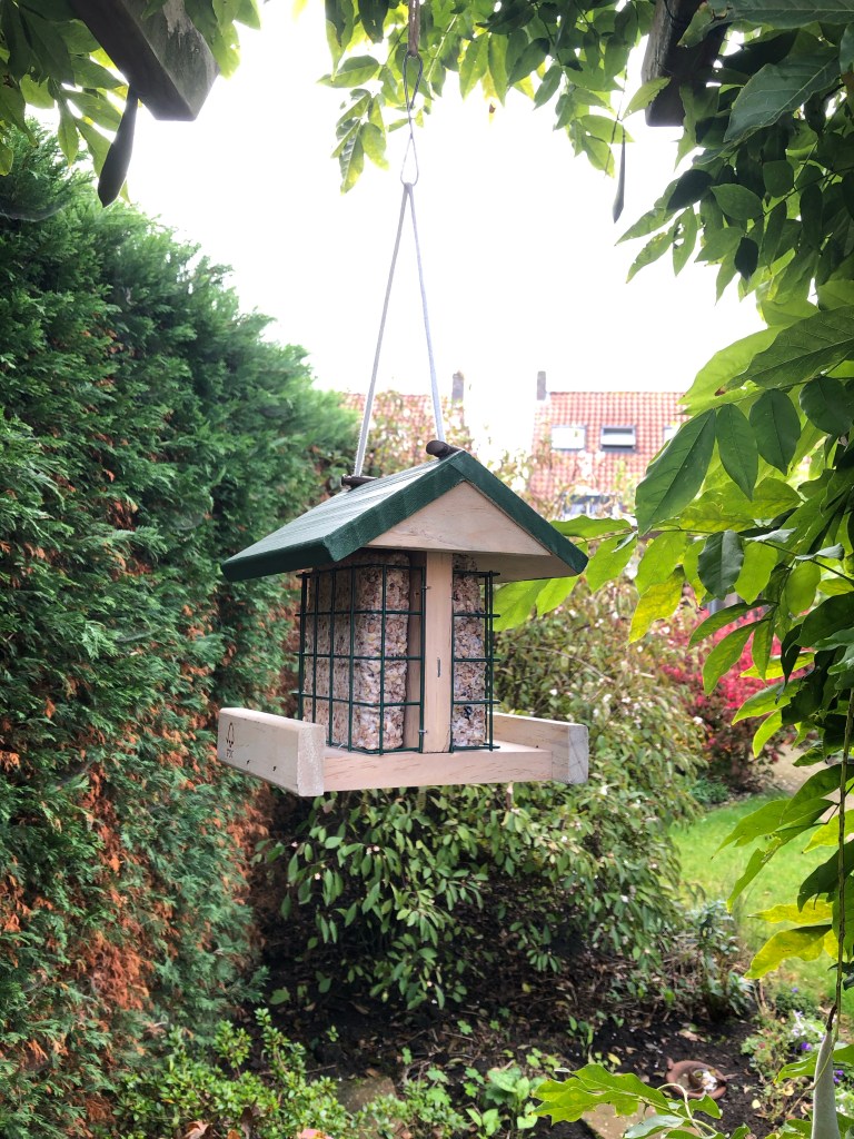 Bio vogelzaad voor in de voedersilo.Een huisje met vetblokken (in de hoop dat een heel huisje meenemen zelfs de kauwen te gortig is)Een gevulde halve kokosnoot (omdat ik die zo leuk vind)Roodborstjes-strooivoer