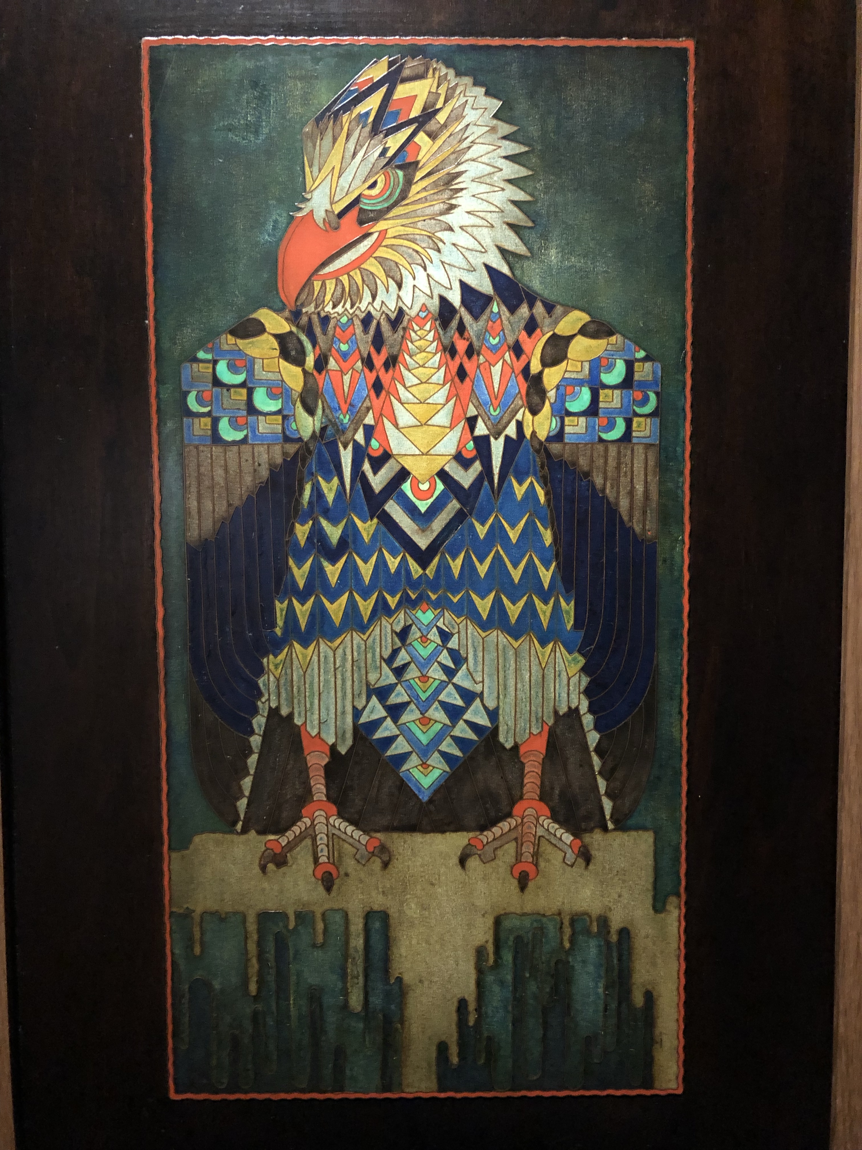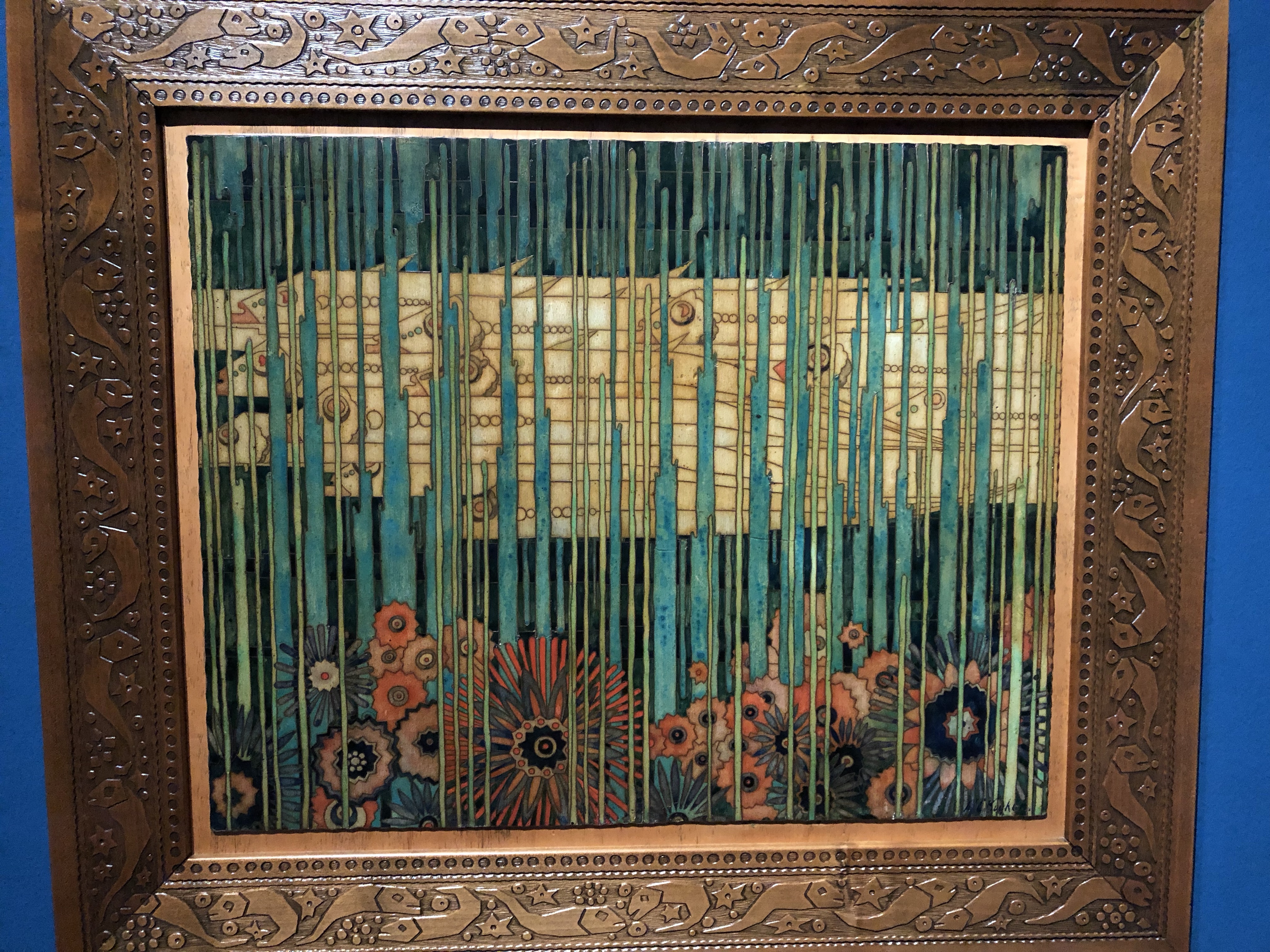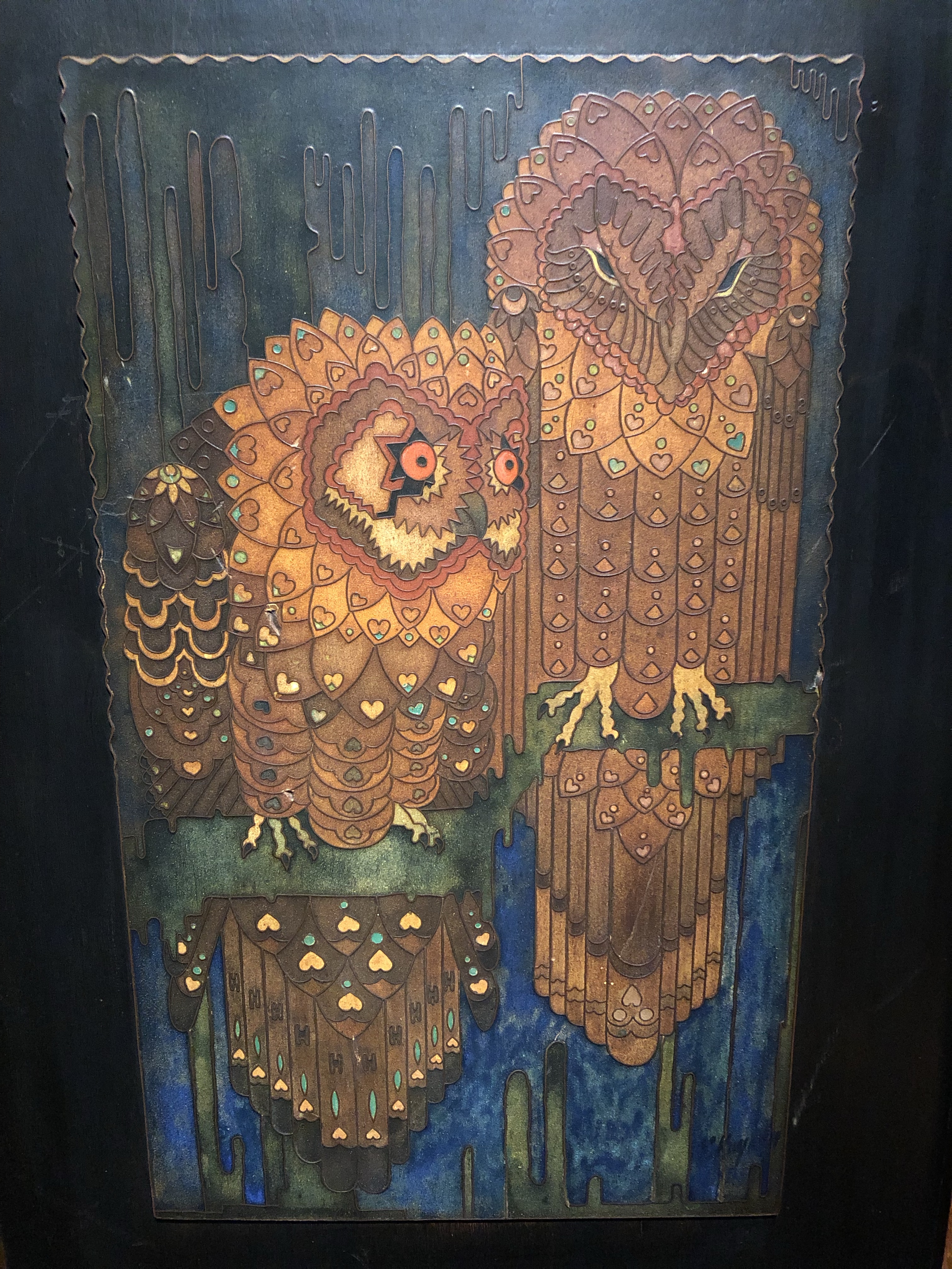 Schitterende ontwerpen, zeer gedetailleerd uitgevoerd. Héél dunne koperen strips die in hout werden geslagen, waarna de ruimtes werden opgevuld met een mengsel van gips en gelatine. Vervolgens werd de afbeelding ingekleurd met waterverf.