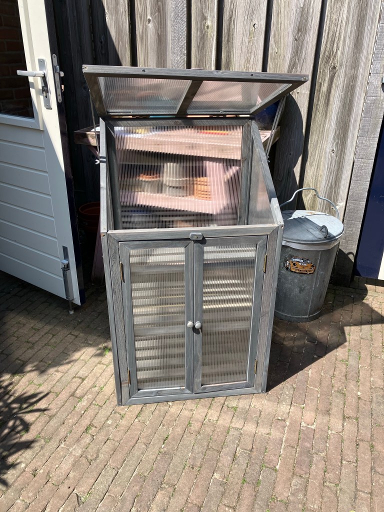 Toen we de grote pot kochten bij het tuincentrum, zag ik een kas(t)je. Meneer K_dootje was nog niet helemaal overtuigd, maar toen bij thuis meten bleek dat het op een keurig plekje zou passen ben ik het alsnog gaan kopen.