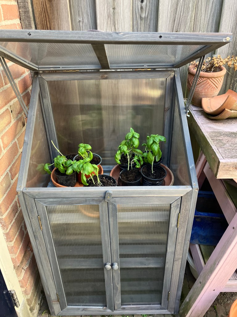Ik vind het helemaal leuk! Er staan nu basilicumplantjes in (ik bevrijdde de plantjes uit een potje van de supermarkt), ik zaaide pompoen en courgette en kreeg twee tomatenplantjes.