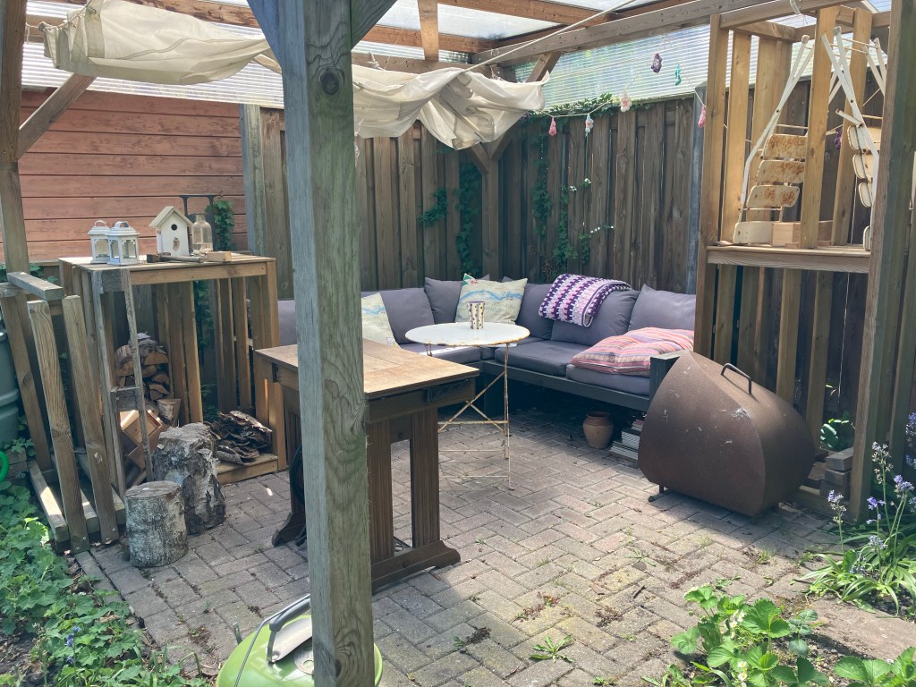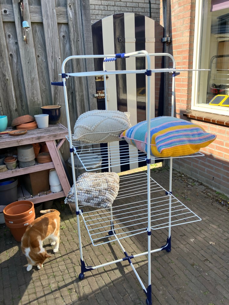 Nu kunnen we er tenminste weer zitten. De kussens moeten nog even verder drogen na hun wasbeurt, gelukkig gaat dat snel met dit weer!