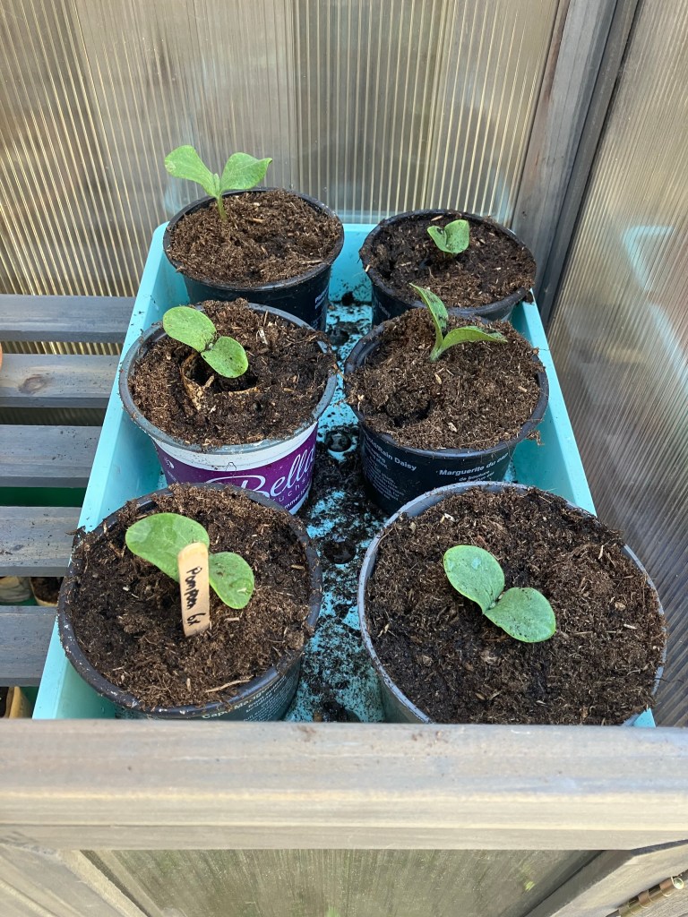De pompoenen mochten van hun kweekpotje in een groter potje.