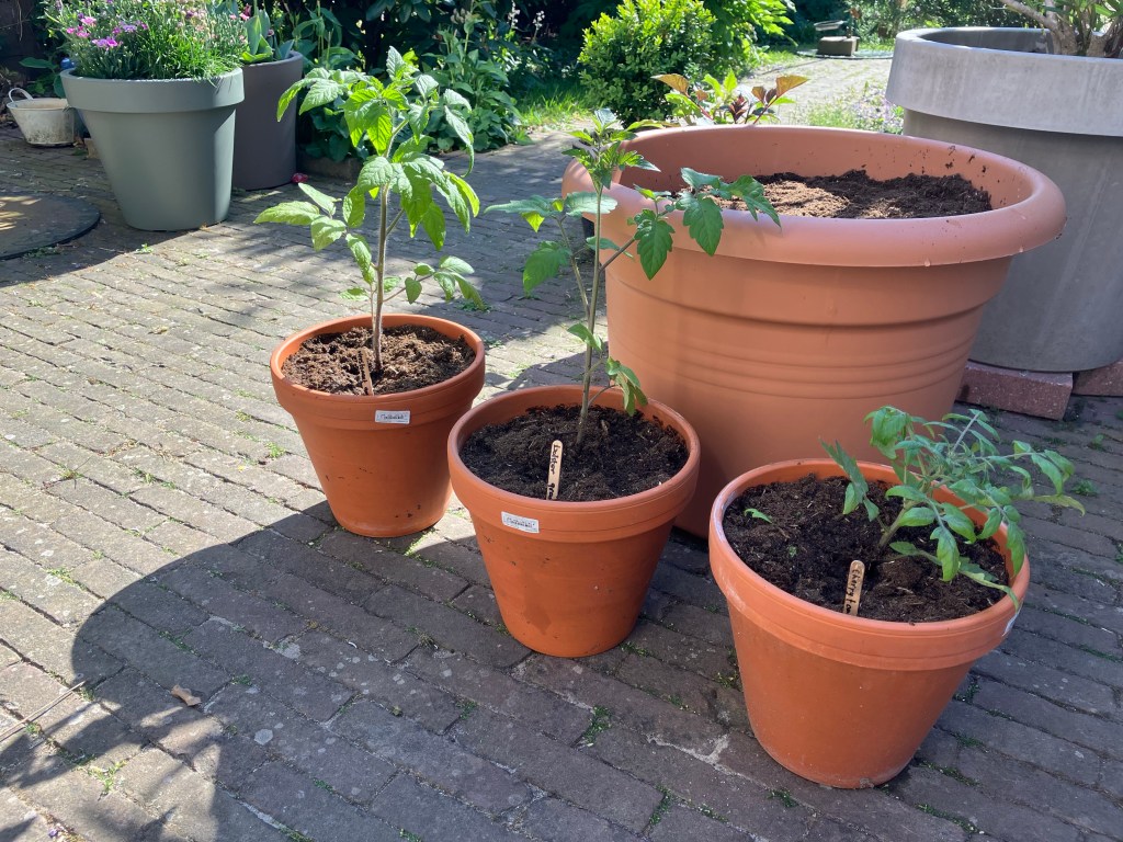 De gekregen tomatenplantjes waren alledrie ook flink gegroeid, dus die mochten in hun definitieve pot.