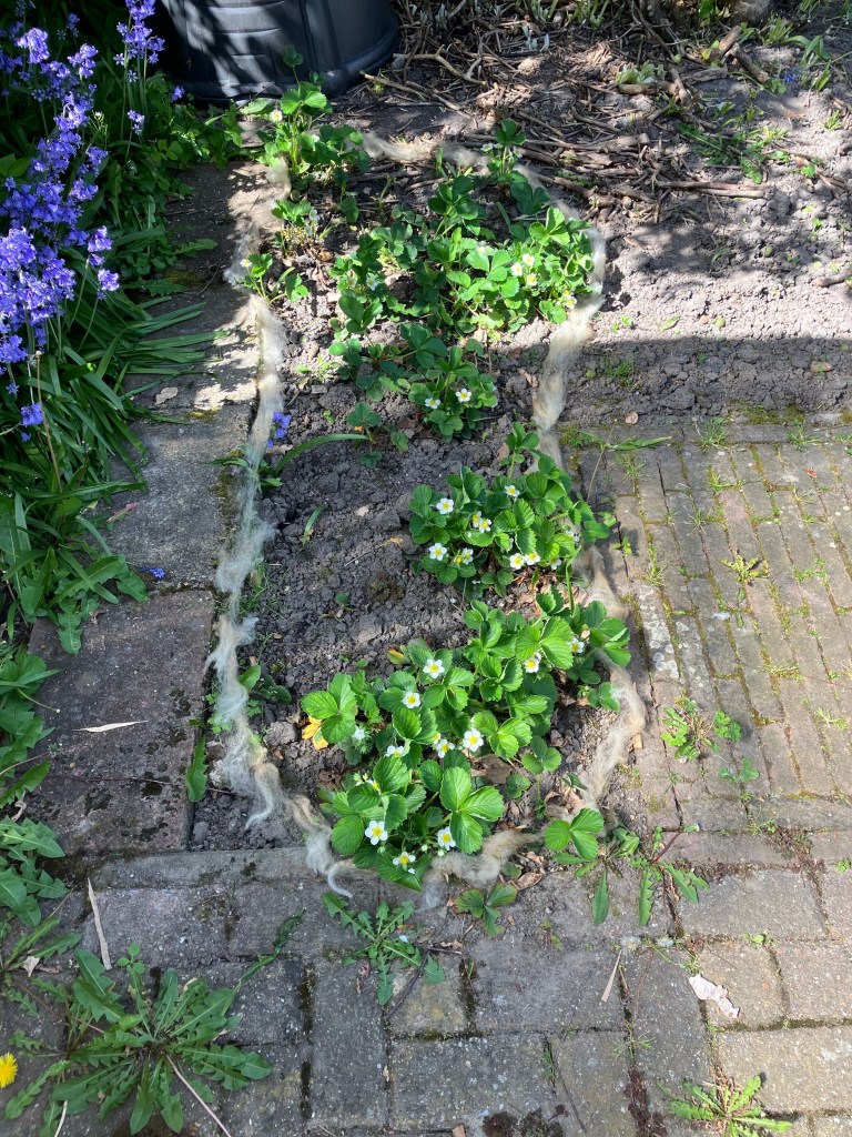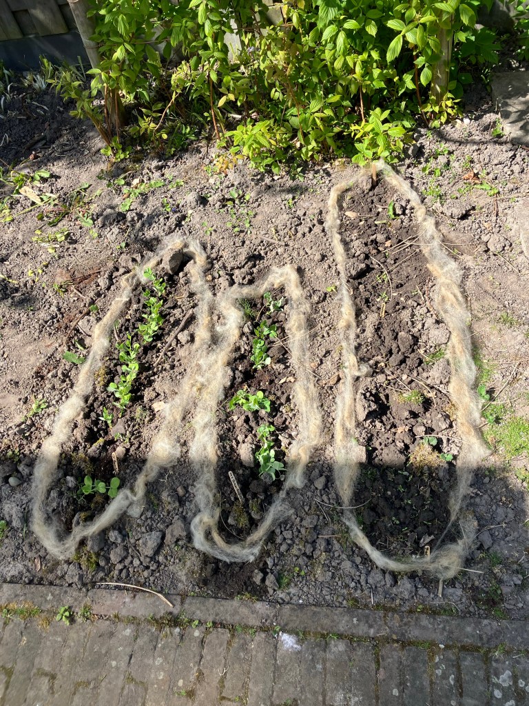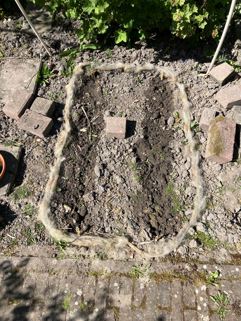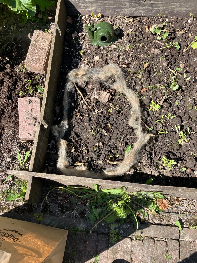 Ik las er ergens over en Lies vertelde erover: wol gebruiken tegen slakken. Ik ben erg voor het gebruik van wol voor wat dan ook. En gelukkig hadden Lies en Yep een heleboel extra schapenvacht gekocht, dus mocht ik bij hen wat ophalen.