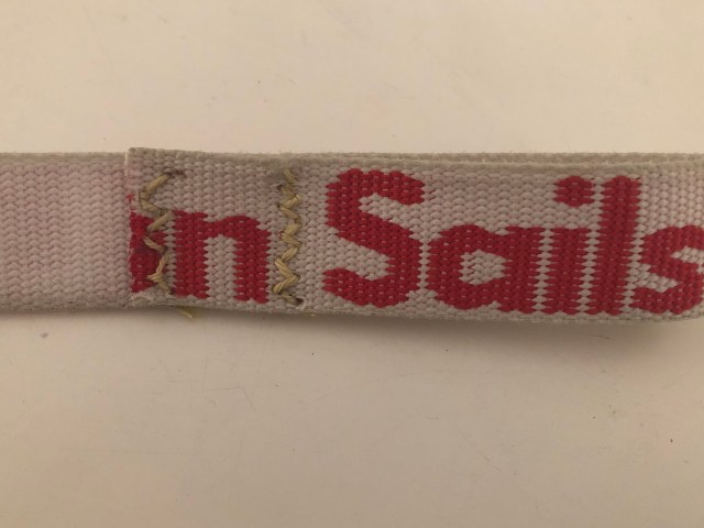 Aan boord hebben we (uiteraard) meerdere zeilbandjes. Een set oude (zie boven) en een set nieuwe. De oude zijn van lekker stevig materiaal, niet te stug om te knopen en niet te glad zodat de knopen niet zomaar los gaan. De lusjes zijn helaas aan het doorslijten, waardoor we ze niet meer voor alles kunnen gebruiken.