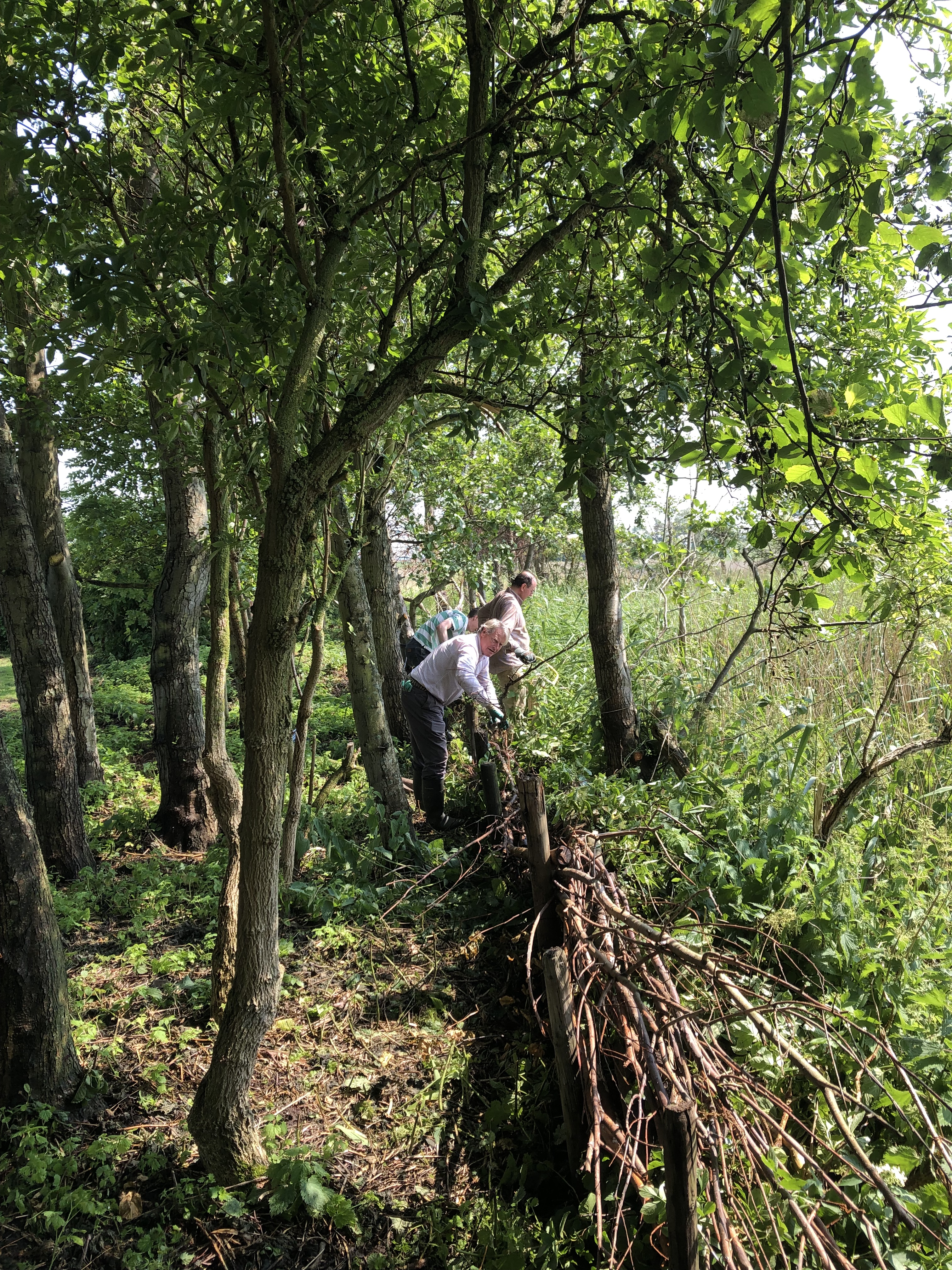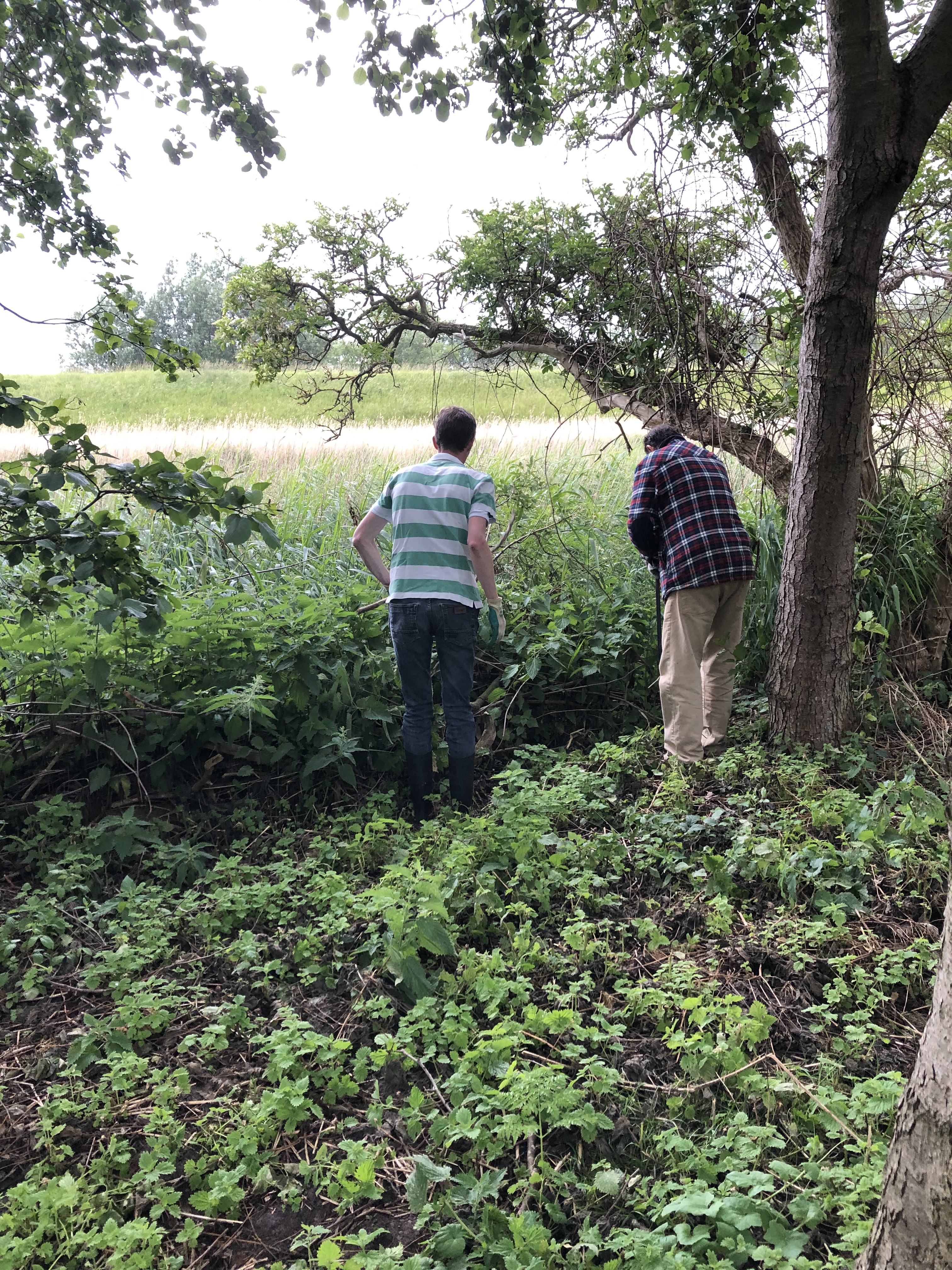 Met beleid en inzicht bepaalden de heren de loop van de ril en de plaats van eventuele paaltjes. Bestaande bomen en struiken gebruiken was natuurlijk de leukste uitdaging.