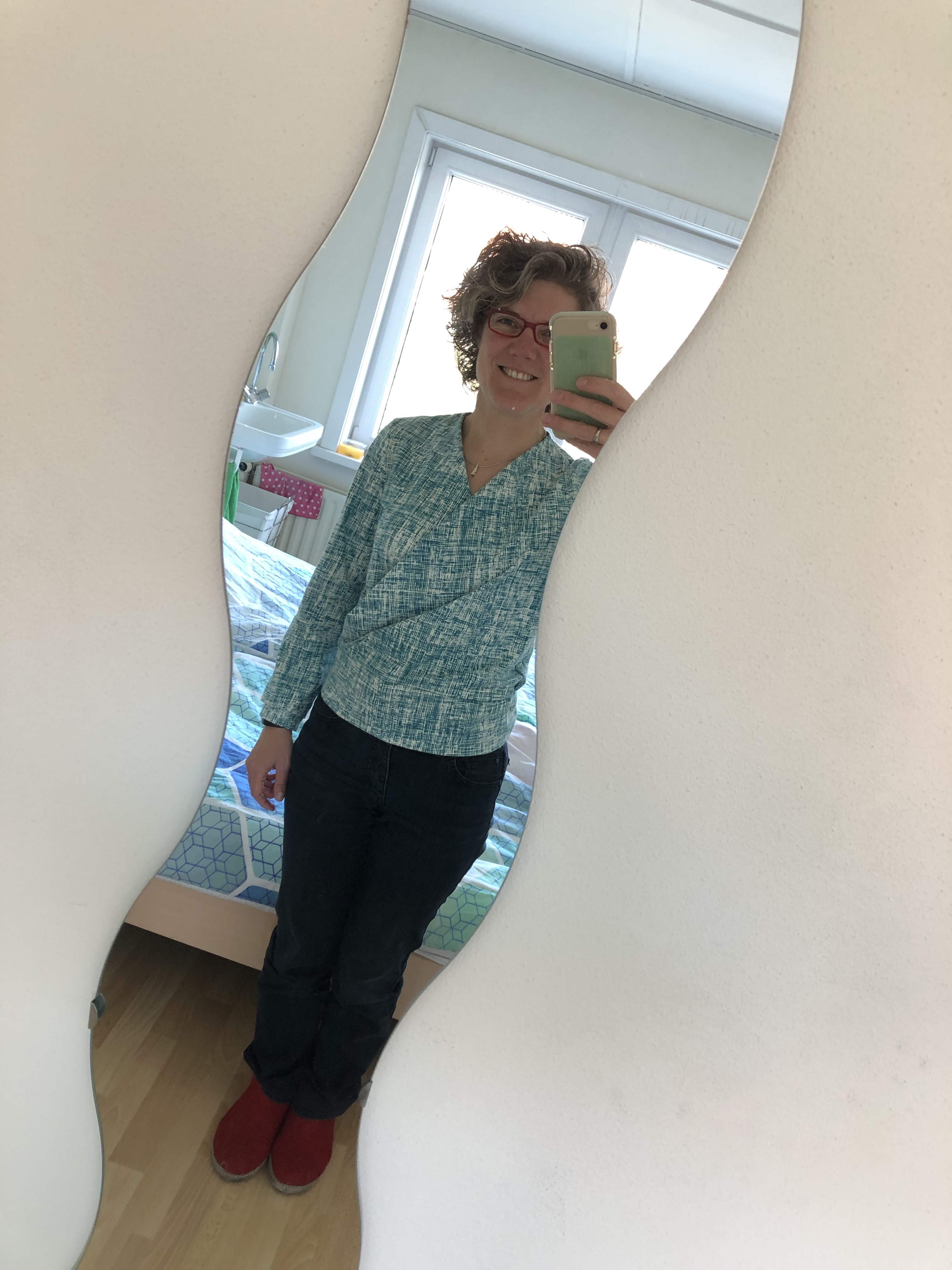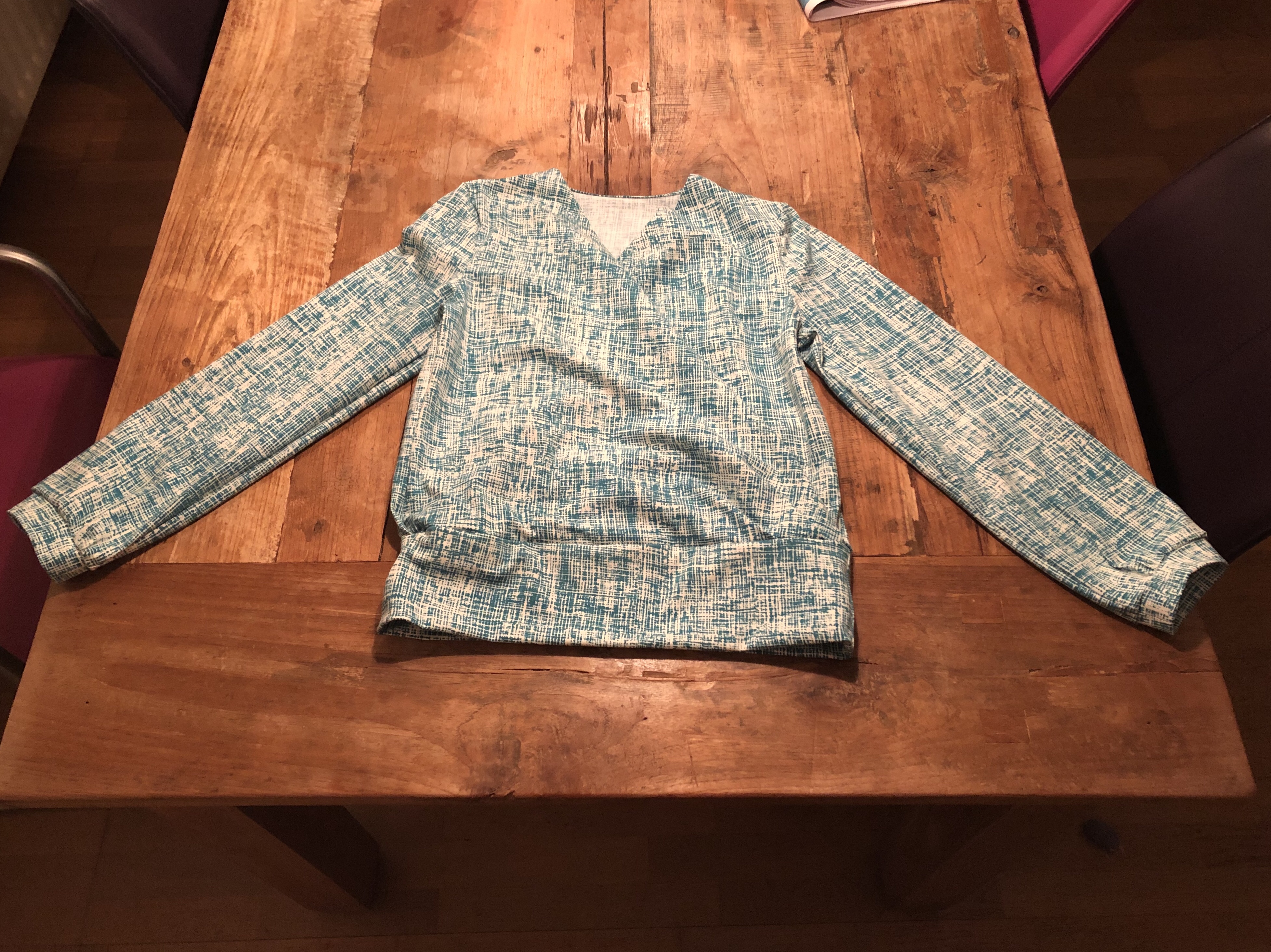 Dus gisteravond laat was ik klaar met het in elkaar naaien van deze blouse (? shirt?) die al een tijdje geknipt en wel lag te wachten bij de naaimachine. Strijken vond ik op dat tijdstip geen prioriteit…