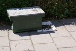 Deze bijen zijn kennelijk erg braaf, ze zitten ’s middags al vrijwel allemaal binnen. ’s Avonds heeft meneer Van der Scheer de kast weer opgehaald en de bijen verhuisd naar hun nieuwe stek.