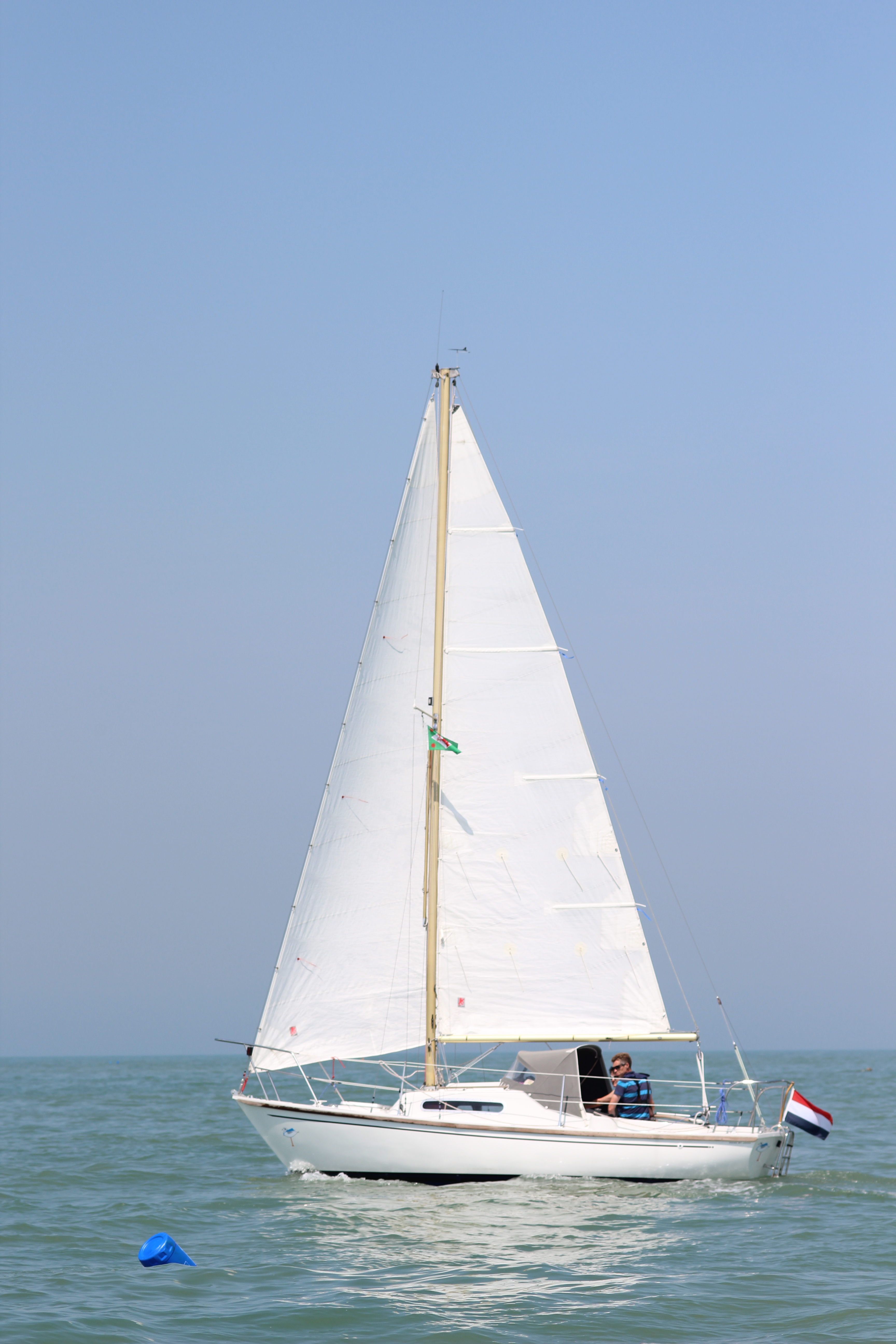 In Monnickendam aangekomen bleek het heerlijk weer. Met nauwelijks tot geen wind, dat wel. Na het te water laten en optuigen van de boot en de voorbespreking heeft trainer Ben Koppelaar de drie aanwezige boten naar de haven uit gesleept. Daar waaide het ook niet. We hebben een eiland gemaakt** en ons laten bedelven onder de vliegen. Geef mij maar zout water om op te varen…